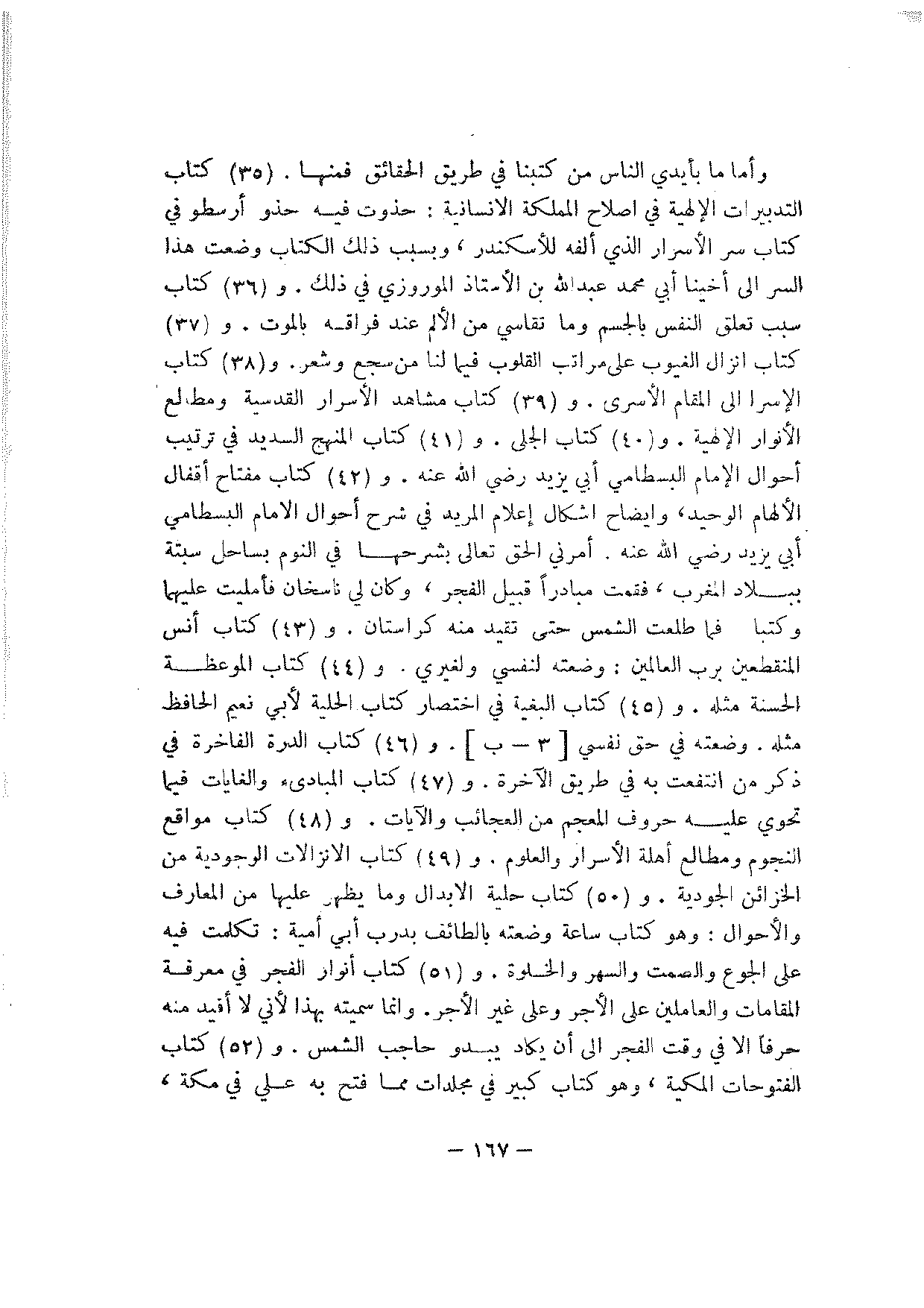 وأما ما بأيدي الناس من كتبنا في طريق الحقائق فمنها. (35) كتاب التدبيرات الإلهية في إصلاح المملكة الإنسانية: حذوت فيه حذو أرسطو في كتاب سر الأسرار الذي ألفه للأسكندر، وبسبب ذلك الكتاب وضعت هذا السر إلى أخينا أبي محمد عبد الله بن الأستاذ الموروزي في ذلك. و (36) كتاب سبب تعلق النفس بالجسم وما تقاسي من الألم عند فراقه بالموت. و (37) كتاب إنزال الغيوب على مراتب القلوب فيما لنا من سجع وشعر. و (38) كتاب الإسرا إلى المقام الأسرى. و (39) كتاب مشاهد الأسرار القدسية ومطالع الأنوار الإلهية. و (40) كتاب الجلي. و (41) كتاب المنهج السديد في ترتيب أحوال الإمام البسطامي أبي يزيد رضي الله عنه. و (42) كتاب مفتاح أقفال الإلهام الوحيد، وإيضاح إشكال إعلام المريد في شرح أحوال الإمام البسطامي أبي يزيد رضي الله عنه. أمرني الحق تعالى بشرحها في النوم بساحل سبتة ببلاد المغرب، فقمت مبادرا قبيل الفجر، وكان لي ناسخان فأمليت عليهما وكتبا فما طلعت الشمس حتى تقيد منه كراستان. و (43) كتاب أنس المنقطعين برب العالمين: وضعته لنفسي ولغيري. و (44) كتاب الموعظة الحسنة مثله. و (45) كتاب البغية في اختصار كتاب الحلية لأبي نعيم الحافظ مثله. وضعته في حق نفسي [3 - ب]. و (46) كتاب الدرة الفاخرة في ذكر من انتفعت به في طريق الآخرة. و (47) كتاب المبادئ والغايات فيما تحوي عليه حروف المعجم من العجائب والآيات. و (48) كتاب مواقع النجوم ومطالع أهله الأسرار والعلوم. و (49) كتاب الانزالات الوجودية من الخزائن الجودية. و (50) كتاب حلية الابدال وما يظهر عليها من المعارف والأحوال: وهو كتاب ساعة وضعته بالطائف بدرب أبي أمية: تكلمت فيه على الجوع والصمت والسهر والخلوة. و (51) كتاب أنوار الفجر في معرفة المقامات والعاملين على الأجر وعلى غير الأجر. وإنما سميته بهذا لأني لا أقيد منه حرفا إلا في وقت الفجر إلى أن يكاد يبدو حاجب الشمس. و (52) كتاب الفتوحات المكية، وهو كتاب كبير في مجلدات مما فتح به علي في مكة،