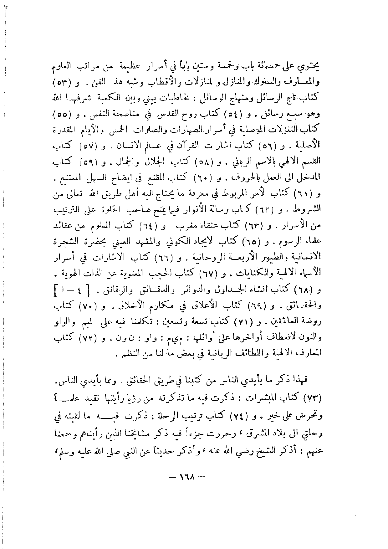 فهذا ذكر ما بأيدي الناس من كتبنا في طريق الحقائق. ومما بأيدي الناس. (73) كتاب المبشرات: ذكرت فيه ما تذكرته من رؤيا رأيتها تفيد علما وتحرض على خير. و (74) كتاب ترتيب الرحلة: ذكرت فيه ما لقيته في رحلتي إلى بلاد المشرق، وحررت جزءا فيه ذكر مشايخنا الذين رأيناهم وسمعنا عنهم: أذكر الشيخ رضي الله عنه، وأذكر حديثا عن النبي صلى الله عليه وسلم،