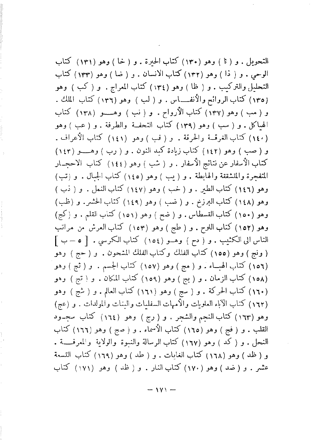 التحويل. و (ثا) وهو (130) كتاب الحيرة. و (ثا) وهو (130) كتاب الحيرة. و (خا) وهو (131) كتاب الوحي. و (ذا) وهو (132) كتاب الإنسان. و (ضا) وهو (133) كتاب التحليل والتركيب. و (ظا) وهو (134) كتاب المعراج. و (كب) وهو (135) كتاب الروائح والأنفاس. و (لب) وهو (136) كتاب الملك. و (مب) وهو (137) كتاب الأرواح. و (نب) وهو (138) كتاب الهياكل. و (سب) وهو (139) كتاب التحفة والطرفة. و (عب) وهو (140) كتاب الغرقة والحرقة. و (فب) وهو (141) كتاب الأعراف. و (صب) وهو (142) كتاب زيادة كبد النون. و (رب) وهو (143) كتاب الأسفار عن نتائج الأسفار. و (شب) وهو (144) كتاب الأحجار المتفجرة والمتشققة والهابطة. و (يب) وهو (145) كتاب الجبال. و (تب) وهو (146) كتاب الطير. و (خب) وهو (147) كتاب النمل. و (ذب) وهو (148) كتاب البرزخ. و (ضب) وهو (149) كتاب الحشر. و (ظب) وهو (150) كتاب القسطاس. و (ضح) وهو (151) كتاب القلم. و (كج) وهو (152) كتاب اللوح. و (طج) وهو (153) كتاب العرش من مراتب الناس إلى الكثيب. و (دح) وهو (154) كتاب الكرسي. [5 - ب] (ونج) وهو (155) كتاب الفلك وكتاب الفلك المشحون. و (حج) وهو (156) كتاب الهباء. و (مج) وهو (157) كتاب الجسم. و (ثج) وهو (158) كتاب الزمان. و (بج) وهو (159) كتاب المكان. و (تج) وهو (160) كتاب الحركة. و (سج) وهو (161) كتاب العالم. و (شج) وهو (162) كتاب الآباء العلويات والأمهات السلفيات والبنات والمولدات. و (عج) وهو (163) كتاب النجم والشجر. و (رج) وهو (164) كتاب سجود القلب. و (فج) وهو (165) كتاب الأسماء. و (صج) وهو (166) كتاب النحل. و (كد) وهو (167) كتاب الرسالة والنبوة والولاية والمعرفة. و (ظد) وهو (168) كتاب الغايات. و (طد) وهو (169) كتاب التسعة عشر. و (ضد) وهو (170) كتاب النار. و (ظد) وهو (171) كتاب