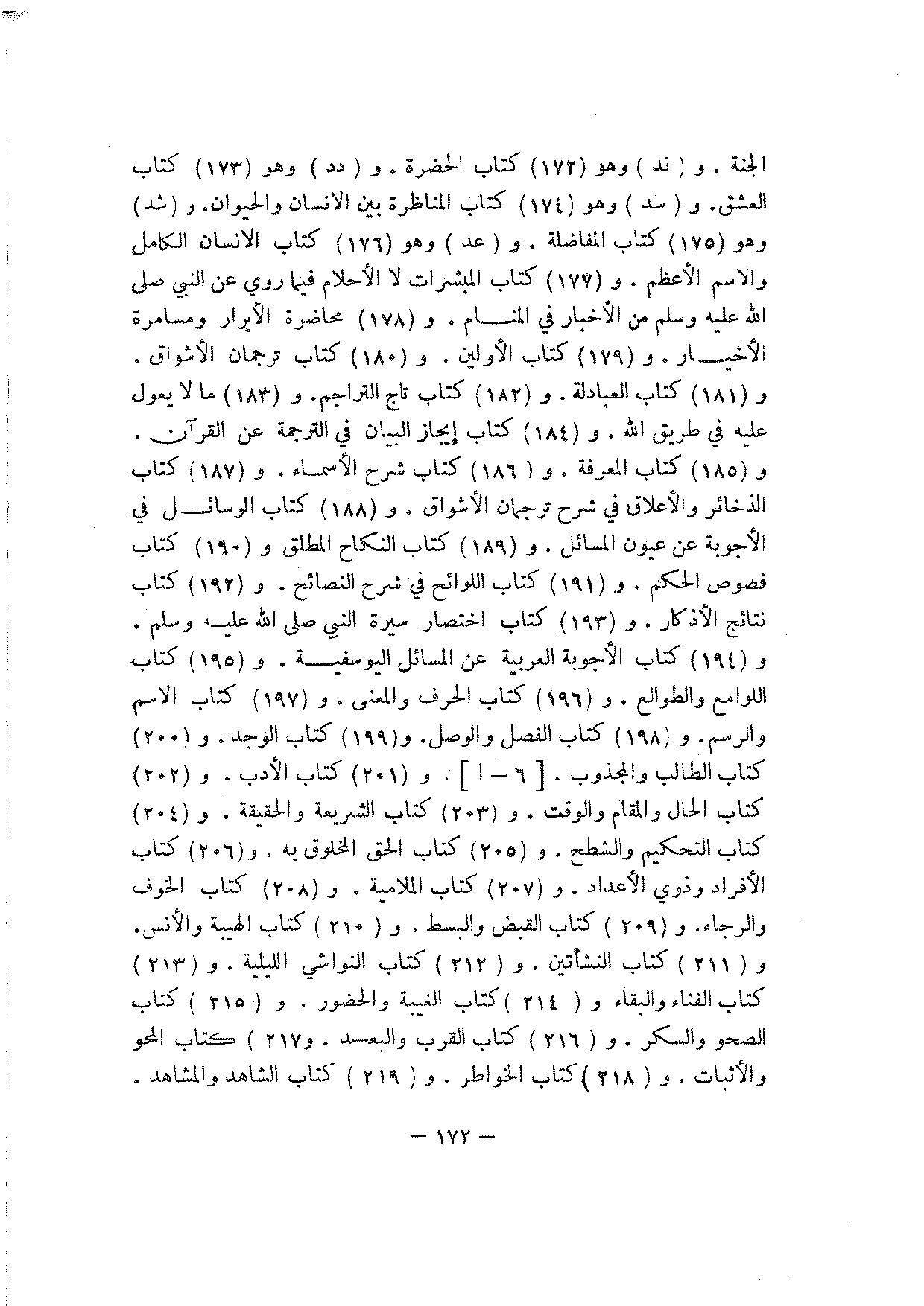 الجنة. و (ند) وهو (172) كتاب الحضرة. و (دد) وهو (173) كتاب العشق. و (سد) وهو (174) كتاب المناظرة بين الإنسان والحيوان. و (شد) وهو (175) كتاب المفاضلة. و (عد) وهو (176) كتاب الإنسان الكامل والاسم الأعظم. و (177) كتاب المبشرات لا الأحلام فيما روي عن النبي صلى الله عليه وسلم من الأخبار في المنام. و (178) محاضرة الأبرار ومسامرة الأخيار. و (179) كتاب الأولين. و (180) كتاب ترجمان الأشواق. و (181) كتاب العبادلة. و (182) كتاب تاج التراجم. و (183) ما لا يعول عليه طريق الله. و (184) كتاب إيجاز البيان في الترجمة عن القرآن. و (185) كتاب المعرفة. و (186) كتاب شرح الأسماء. و (187) كتاب الذخائر والأعلاق في شرح ترجمان الأشواق. و (188) كتاب الوسائل في الأجوبة عن عيون المسائل. و (189) كتاب النكاح المطلق و (190) كتاب فصوص الحكم. و (191) كتاب اللوائح في شرح النصائح. و (192) كتاب نتائج الأذكار. و (193) كتاب اختصار سيرة النبي صلى الله عليه وسلم. و (194) كتاب الأجوبة العربية عن المسائل اليوسفية. و (195) كتاب اللوامع والطوالع. و (196) كتاب الحرف والمعنى. و (197) كتاب الاسم والرسم. و (198) كتاب الفصل والوصل. و (199) كتاب الوجد. و (200) كتاب الطالب والمجذوب. [6 - ا [. و (201) كتاب الأدب. و (202) كتاب الحال والمقام والوقت. و (203) كتاب الشريعة والحقيقة. و (204) كتاب التحكيم والشطح. و (205) كتاب الحق المخلوق به. و (206) كتاب الأفراد وذوي الأعداد. و (207) كتاب الملامية. و (208) كتاب الخوف والرجاء. و (209) كتاب القبض والبسط. و (210) كتاب الهيبة والأنس. و (211) كتاب النشأتين. و (212) كتاب النواشي الليلية. و (213) كاب الفناء والبقاء و (214) كتاب الغيبة والحضور. و (215) كتاب الصحو والسكر. و (216) كتاب القريب والبعد. و (217) كتاب المحو والإثبات. و (218) كتاب الخواطر. و (219) كتاب الشاهد والمشاهد.
