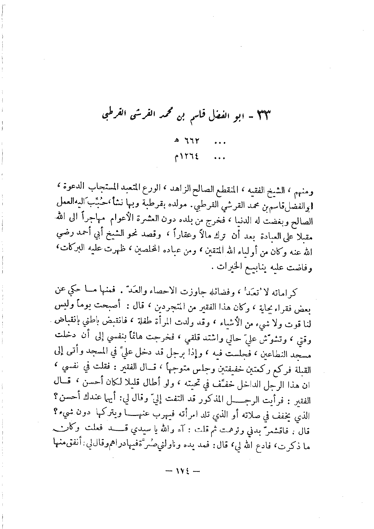 ومنهم، الشيخ الفقيه، المنقطع الصالح الزاهد، الورع المتعبد المستجاب الدعوة، أبو الفضل قاسم بن محمد القرشي القرطبي. مولده بقرطبة وبها نشأ، حبب إليه العمل الصالح وبغضت له الدنيا، فخرج من بلده دون العشرة الأعوام مهاجرا إلى الله مقبلا على العبادة بعد أن ترك مالا وعقارا، وقصد نحو الشيخ أبي أحمد رضي الله عنه وكان من أولياء الله المتقين، ومن عباده المخلصين، ظهرت عليه البركات، وفاضت عليه ينابيع الخيرات.