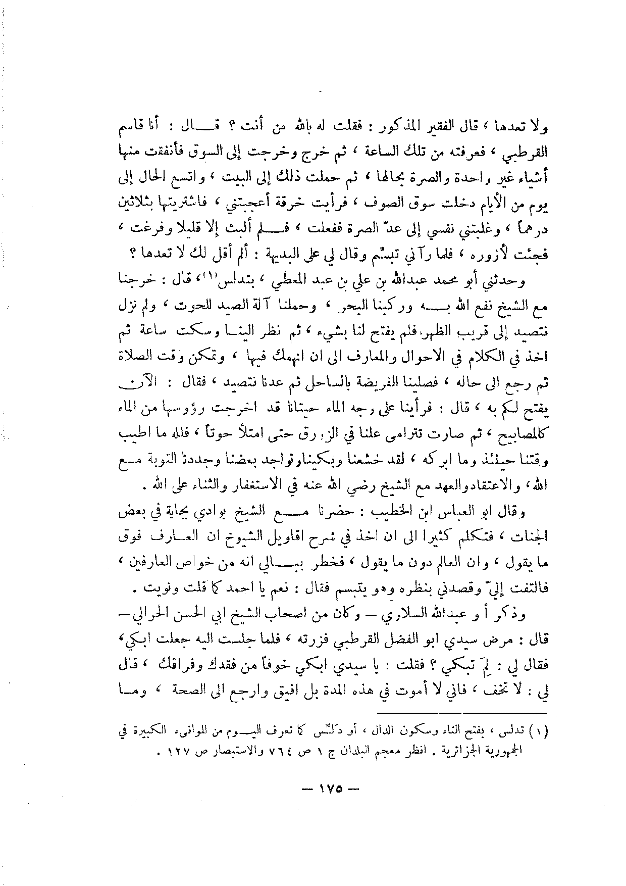 ولا تعدها، قال الفقير المذكور: فقلت له بالله من أنت؟ قال: أنا قاسم القرطبي، فعرفته من تلك الساعة، ثم خرج وخرجت إلى السوق فأنفقت منها أشياء غير واحدة والصرة بحالها، ثم حملت ذلك إلى البيت، واتسع الحال إلى يوم من الأيام دخلت سوق الصوف، فرأيت خرقة أعجبتني، فاشتريتها بثلاثين درهما، وغلبتني نفسي إلى عد الصرة ففعلت، فلم ألبث إلا قليلا وفرغت، فجئت لأزوره، فلما رآني تبسم وقال لي على البديهة: ألم أقل لك لا تعدها؟ وحدثني أبو محمد عبد الله بن علي بن عبد المعطي، بتدلس، قال: خرجنا مع الشيخ نفع الله به وركبنا البحر، وحملنا آلة الصيد للحوت، ولم نزل نتصيد إلى قريب الظهر فلم يفتح لنا بشيء، ثم نظر إلينا وسكت ساعة ثم أخذ في الكلام في الأحوال والمعارف إلى أن انهمك فيها، وتمكن وقت الصلاة ثم رجع إلى حاله، فصلينا الفريضة بالساحل ثم عدنا نتصيد، فقال: الآن يفتح لكم به، قال: فرأينا على وجه الماء حيتانا قد أخرجت رؤوسها من الماء كالمصابيح، ثم صارت تترامى علنا في الرزق حتى امتلأ حوتا، فلله ما أطيب وقتنا حينئذ وما أبركه، لقد خشعنا وبكينا وتواجد بعضنا وجددنا التوبة مع الله، والاعتقاد والعهد مع الشيخ رضي الله عنه في الاستغفار والثناء على الله.