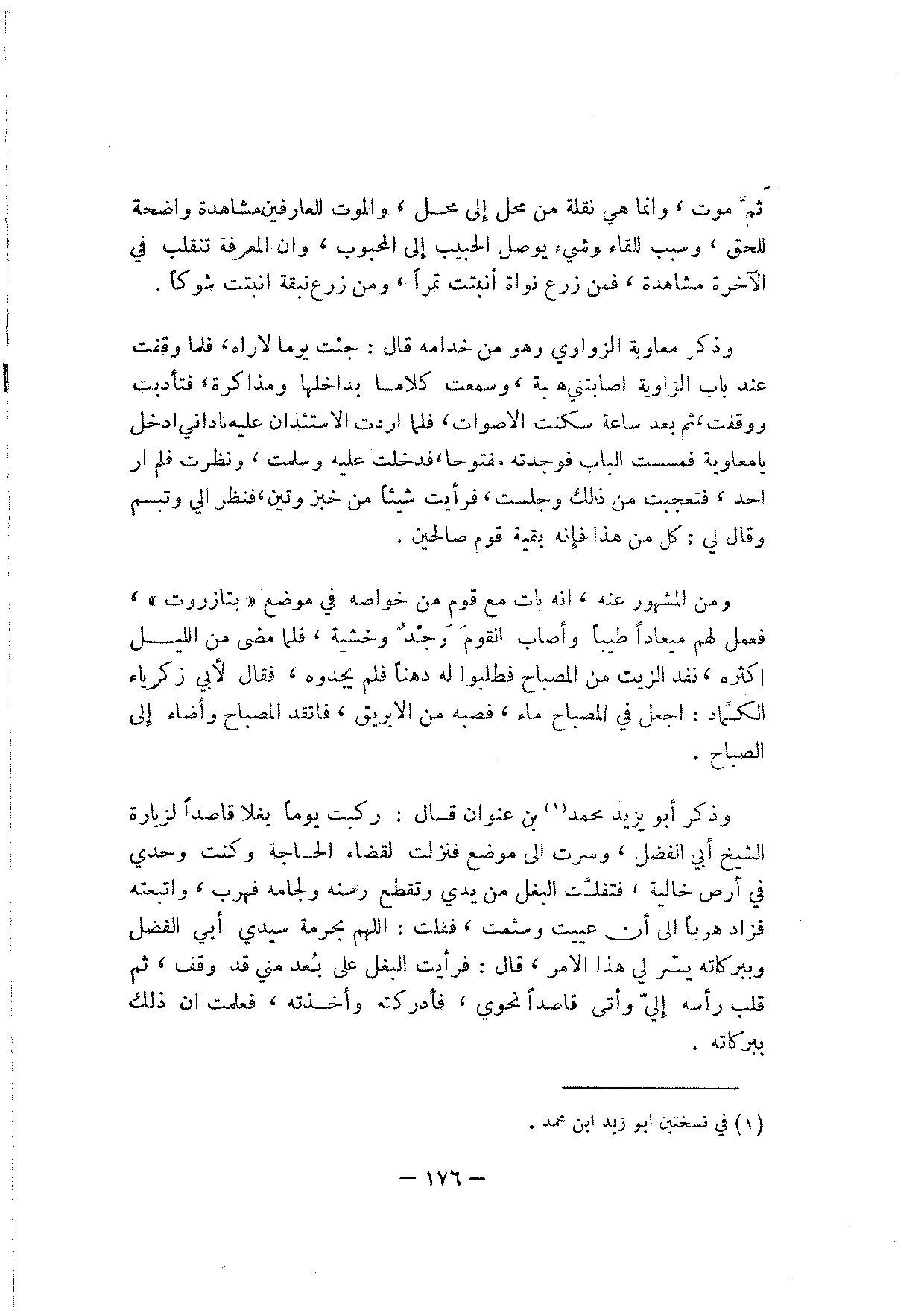 وذكر أبو يزيد محمد بن عنوان قال: ركبت يوما بغلا قاصدا لزيارة الشيخ أبي الفضل، وسرت إلى موضع فنزلت لقضاء الحاجة وكنت وحدي في أرض خالية، فتفلت البغل من يدي وتقطع رسنه ولجامه فهرب، واتبعته فزاد هربا إلى أن عييت وسئمت، فقلت: اللهم بحرمة سيدي أبي الفضل وببركاته يسر لي هذا الأمر، قال: فرأيت البغل على بعد مني قد وقف، ثم قلب رأسه إلي وأتى قاصدا نحوي، فأدركته وأخذته، فعلمت أن ذلك ببركاته.