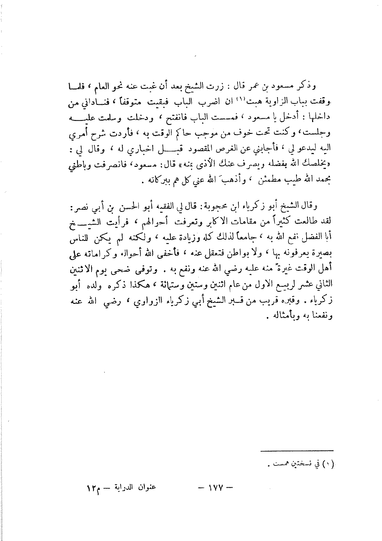 وذكر مسعود بن عمر قال: زرت الشيخ بعد أن غبت عنه نحو العام، فلما وقفت بباب الزاوية هبت أن أضرب الباب فبقيت متوقفا، فناداني من داخلها: أدخل يا مسعود، فمسست الباب فانفتح، ودخلت وسلمت عليه وجلست، وكنت تحت خوف من موجب حاكم الوقت به، فأردت شرح أمري إليه ليدعو لي، فأجابني عن الغرض المقصود قبل إخباري له، وقال لي: "يخلصك الله بفضله ويصرف عنك الأذى بمنه" قال: مسعود، فانصرفت وباطني بحمد الله طيب مطمئن، وأذهب الله عني كل هم ببركاته.