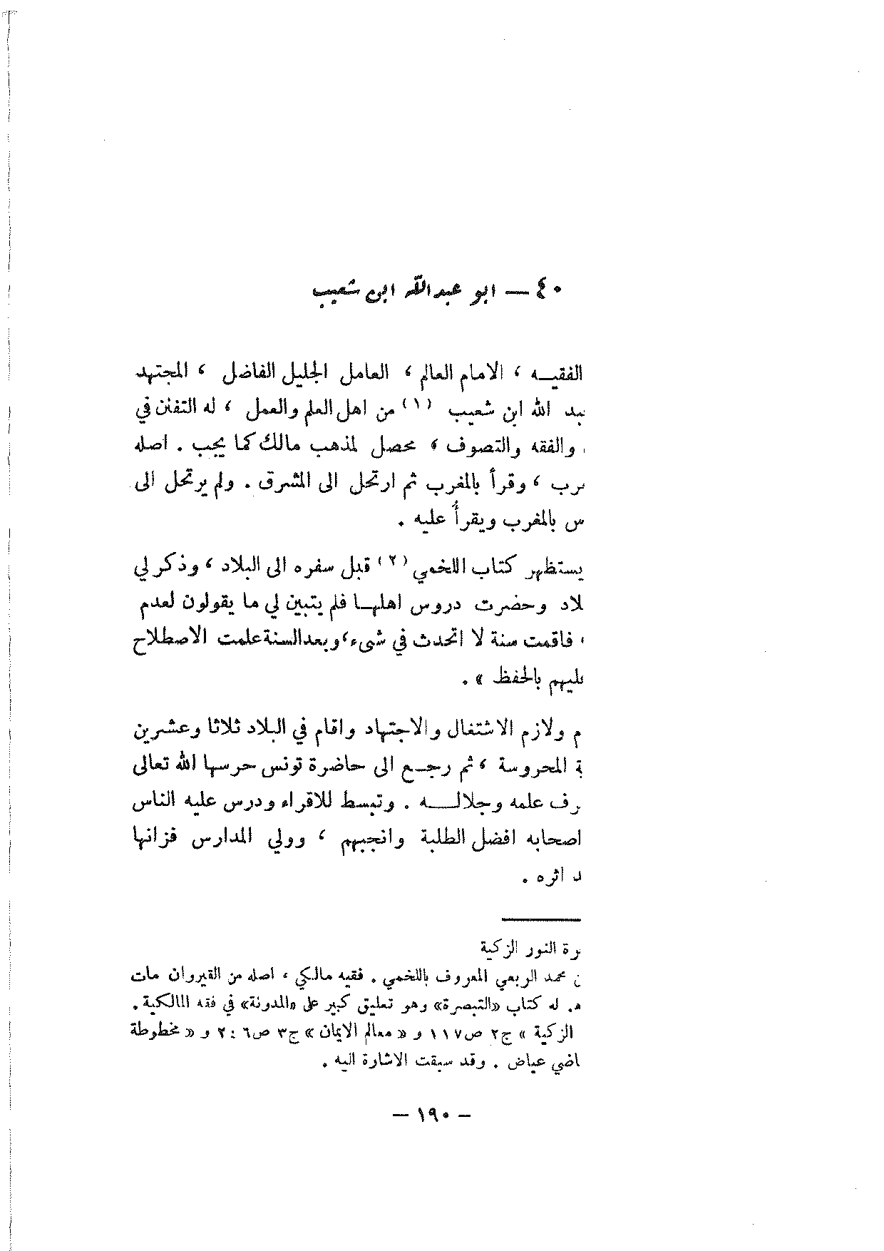 ومنهم، الشيخ الفقيه، الإمام العالم، العامل الجليل الفاضل، المجتهد العابد الموفق، أبو عبد الله ابن شعيب من أهل العلم والعمل، له التفنن في العلوم، عالم بالأصلين والفقه والتصوف، محصل لمذهب مالك كما يجب. أصله من هسكورة من المغرب، وقرأ بالمغرب ثم ارتحل إلى المشرق. ولم يرتحل إلى المشرق حتى كان يدرس بالمغرب ويقرأ عليه.
