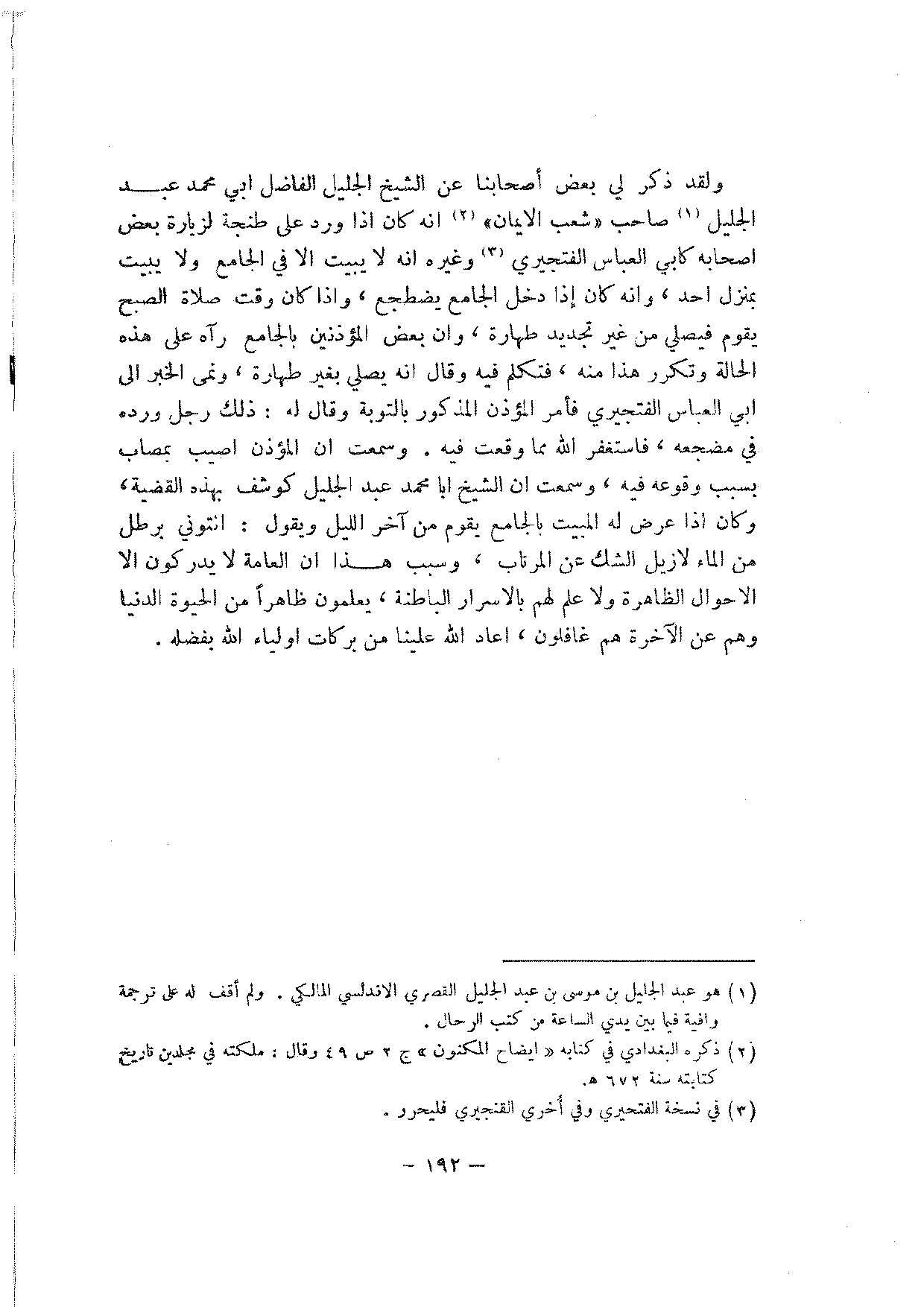 ولقد ذكر لي بعض أصحابنا عن الشيخ الجليل الفاضل أبي محمد عبد الجليل صاحب "شعب الإيمان" إنه كان إذا ورد على طنجة لزيارة بعض أصحابه كابي العباس الفتجيري وغيره إنه لا يبيت إلا في الجامع ولا يبيت بمنزل احد، وإنه كان إذا دخل الجامع يضطجع، وإذا كان وقت صلاة الصبح يقوم فيصلي من غير تجديد طهارة، وان بعض المؤذنين بالجامع رآه على هذه الحالة وتكرر هذا منه، فتكلم فيه وقال إنه يصلي بغير طهارة، ونمى الخبر إلى أبي العباس الفتجيري فأمر المؤذن المذكور بالتوبة وقال له: ذلك رجل ورده في مضجعه، فاستغفر الله مما وقعت فيه. وسمعت أن المؤذن أصيب بمصاب بسبب وقوعه فيه، وسمعت أن الشيخ أبا محمد عبد الجليل كوشف بهذه القضية، وكان إذا عرض له المبيت بالجامع يقوم من آخر الليل ويقول: ائتوني برطل من الماء لأزيل الشك عن المرتاب، وسبب هذا أن العامة لا يدركون إلا الأحوال الظاهرة ولا علم لهم بالأسرار الباطنة، يعلمون ظاهرا من الحيوة الدنيا وهو عن الآخرة هم غافلون، أعاد الله علينا من بركات أولياء الله بفضله.
