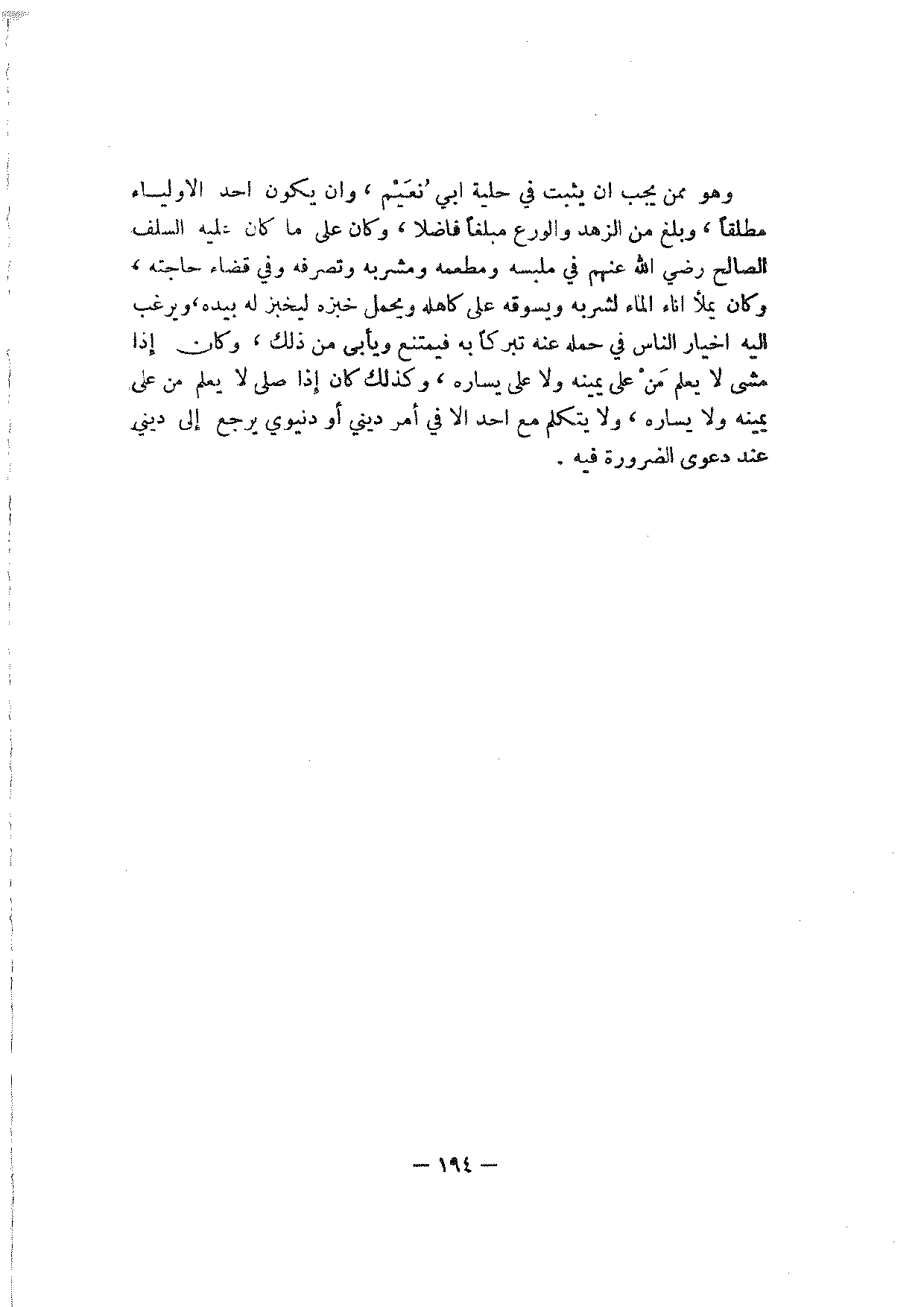 وهو ممن يجب أن يثبت في حلية أبي نعيم، وان يكون أحد الأولياء مطلقا، وبلغ من الزهد والورع مبلغا فاضلا، وكان على ما كان عليه السلف الصالح رضي الله عنهم في ملبسه ومطمعه وتصرفه وفي قضاء حاجته، وكان يملأ إناء الماء لشربه ويسوقه على كاهله ويحمل خبزه ليخبز له بيده، ويرغب إليه أخيار الناس في حمله عنه تبركا به فيمتنع ويأبى من ذلك، وكان إذا مشى لا يعلم من على يمينه ولا على يساره، وكذلك كان إذا صلى لا يعلم من على يمينه ولا يساره، ولا يتكلم مع أحد إلا في أمر ديني أو دنيوي يرجع إلى ديني عند دعوى الضرورة فيه.