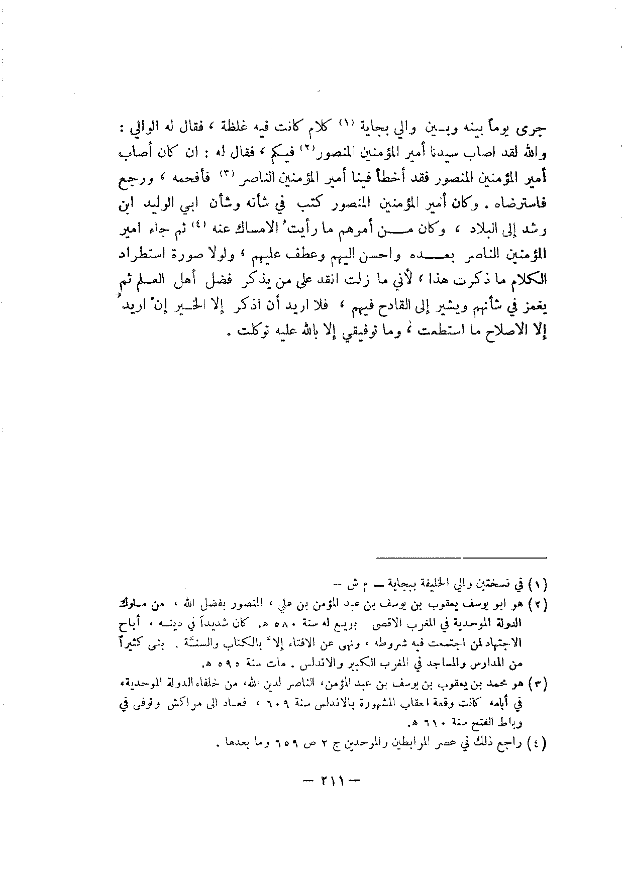 جرى يوما بينه وبين والي بجاية كلام كانت فيه غلظة، فقال له الوالي: والله لقد أصاب سيدنا أمير المؤمنين المنصور فيكم، فقال له: أن كان أصاب أمير المؤمنين فقد أخطأ فينا أمير المؤمنين الناصر فأفحمه، ورجع فاسترضاه. وكان أمير المؤمنين المنصور كتب في شأنه وشأن أبي الوليد ابن رشد إلى البلاد، وكان من أمرهم ما رأيت الإمساك عنه ثم جاء أمير المؤمنين الناصر بعده وأحسن إليهم وعطف عليهم، ولولا صورة استطرد الكلام ما ذكرت هذا، لأني ما زلت أنقد على من يذكر فضل أهل العلم ثم يغمز في شأنهم ويشير إلى القادح فيهم، فلا أريد أن اذكر إلا الخير أن أريد إلا الإصلاح ما استطعت، وما توفيقي إلا بالله عليه توكلت.