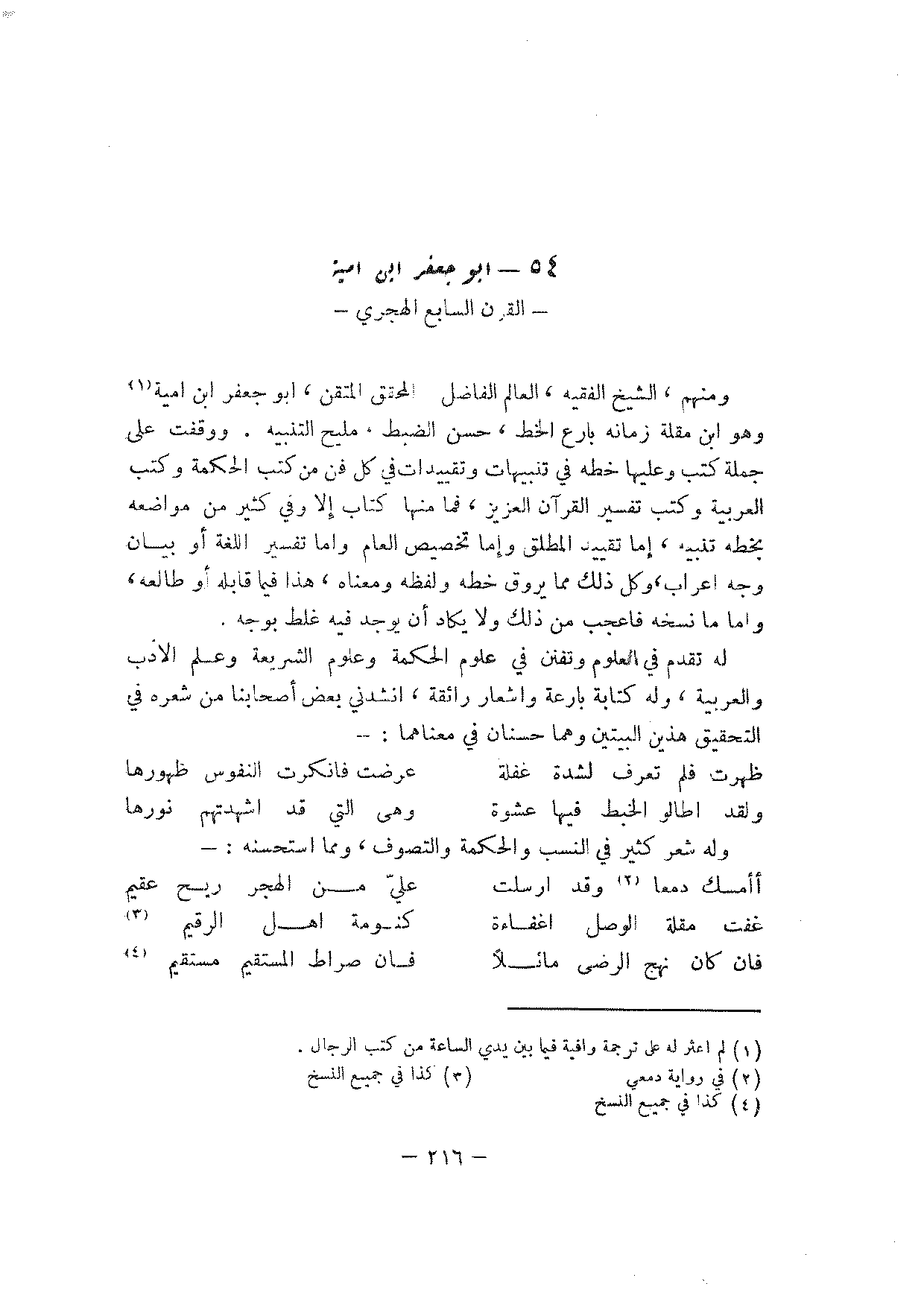 ومنهم، الشيخ الفقيه، العالم الفاضل، المحقق المتقن، أبو جعفر ابن أمية وهو ابن مقلة زمانه بارع الخط، حسن الضبط، مليح التنبيه. ووقفت على جملة كتب وعليها خطه في تنبيهات وتقييدات في كل فن من كتب الحكمة وكتب العربية وكتب تفسير القرآن العزيز، فما منها كتاب إلا وفي كثير من مواضعه بخطه تنبيه، أما تقييد المطلق وإما تخصيص العام وإما تفسير اللغة أو بيان وجه إعراب، وكل ذلك مما يروق خطه ولفظه ومعناه، هذا فيما قابله أو طالعه، وأما ما نسخه فأعجب من ذلك ولا يكاد أن يوجد فيه غلط بوجه.