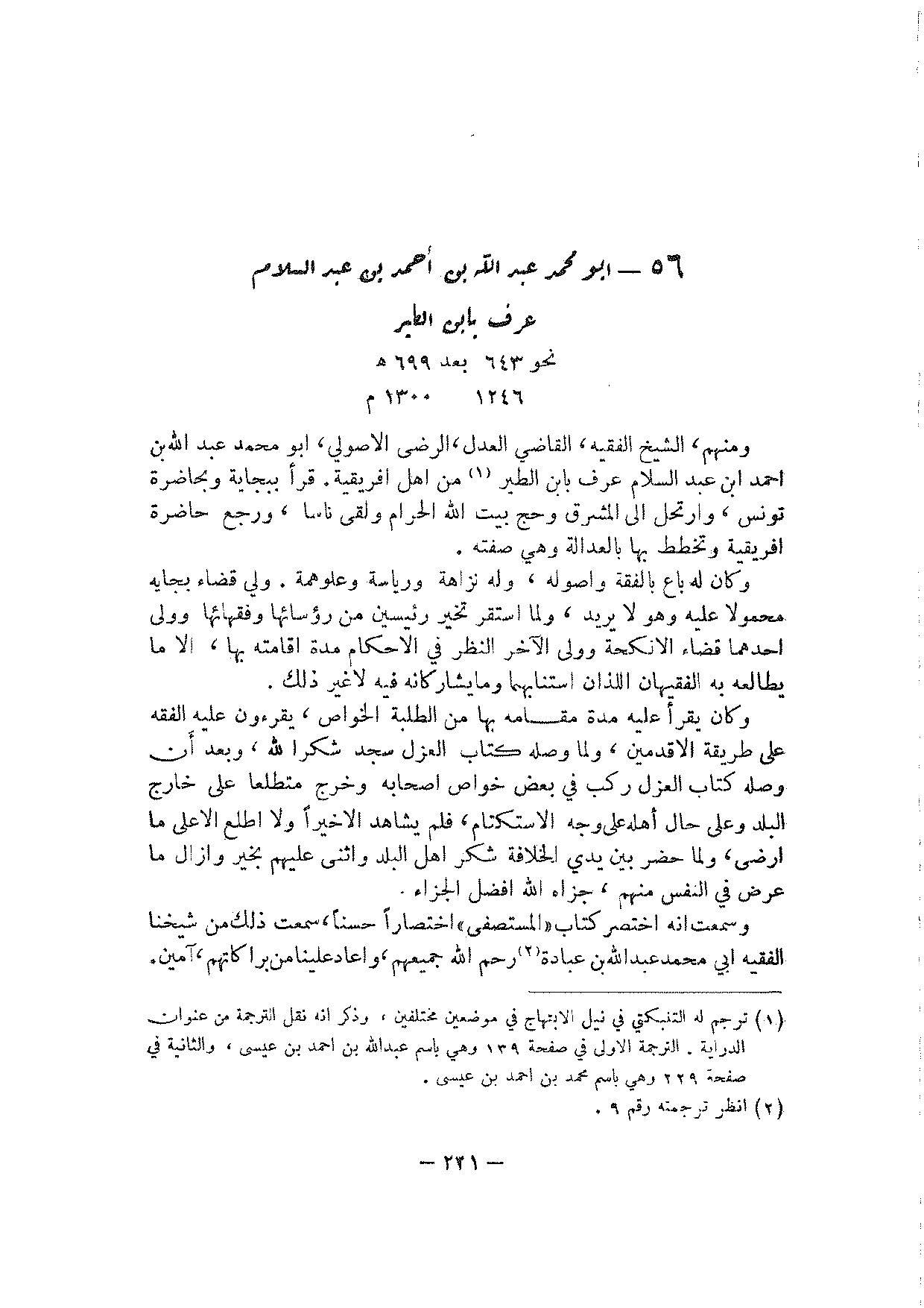 ومنهم، الشيخ الفقيه، القاضي العدل، الرضي الأصولي، أبو محمد عبد الله بن أحمد ابن عبد السلام عرف بابن الطير من أهل افريقية. قرأ ببجاية وبحاضرة تونس، وارتحل إلى المشرق وحج بيت الله الحرام ولقي ناسا، ورجع حاضرة افريقية وتخطط بها بالعدالة وهي صفته.