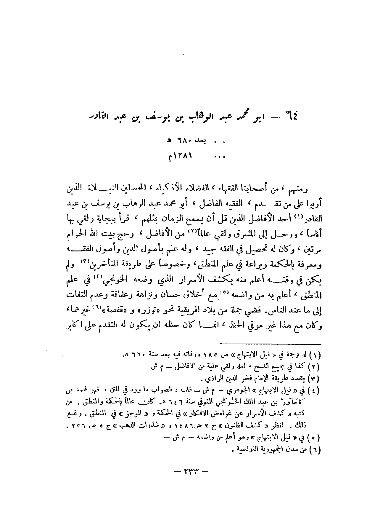 ومنهم، من أصحابنا الفقهاء، الفضلاء الأذكياء، المحصلين النبلاء الذين أربوا على من تقدم، الفقيه الفاضل، أبو محمد عبد الوهاب بن يوسف بن عبد القادر أحد الأفاضل الذين قل أن يسمح الزمان بمثلهم، قرأ ببجاية ولقي بها أناسا، ورحل إلى المشرق ولقي عالما من الأفاضل، وحج بيت الله الحرام مرتين، وكان له تحصيل في الفقه جيد، وله علم بأصول الدين وأصول الفقه ومعرفة بالحكمة وبراعة في علم المنطق، وخصوصا على طريقة المتأخرين ولم يكن في وقته أعلم منه بكشف الأسرار الذي وضعه الخونجي في علم المنطق، أعلم به من واضعه مع أخلاق حسان ونزاهة وعفافة وعدم التفات إلى ما عند الناس. قضي جملة من بلاد افريقية نحو "توزر" و"قفصة" غيرهما، وكان مع هذا غير موفي الحظ، إنما كان حظه أن يكون له التقدم على أكابر