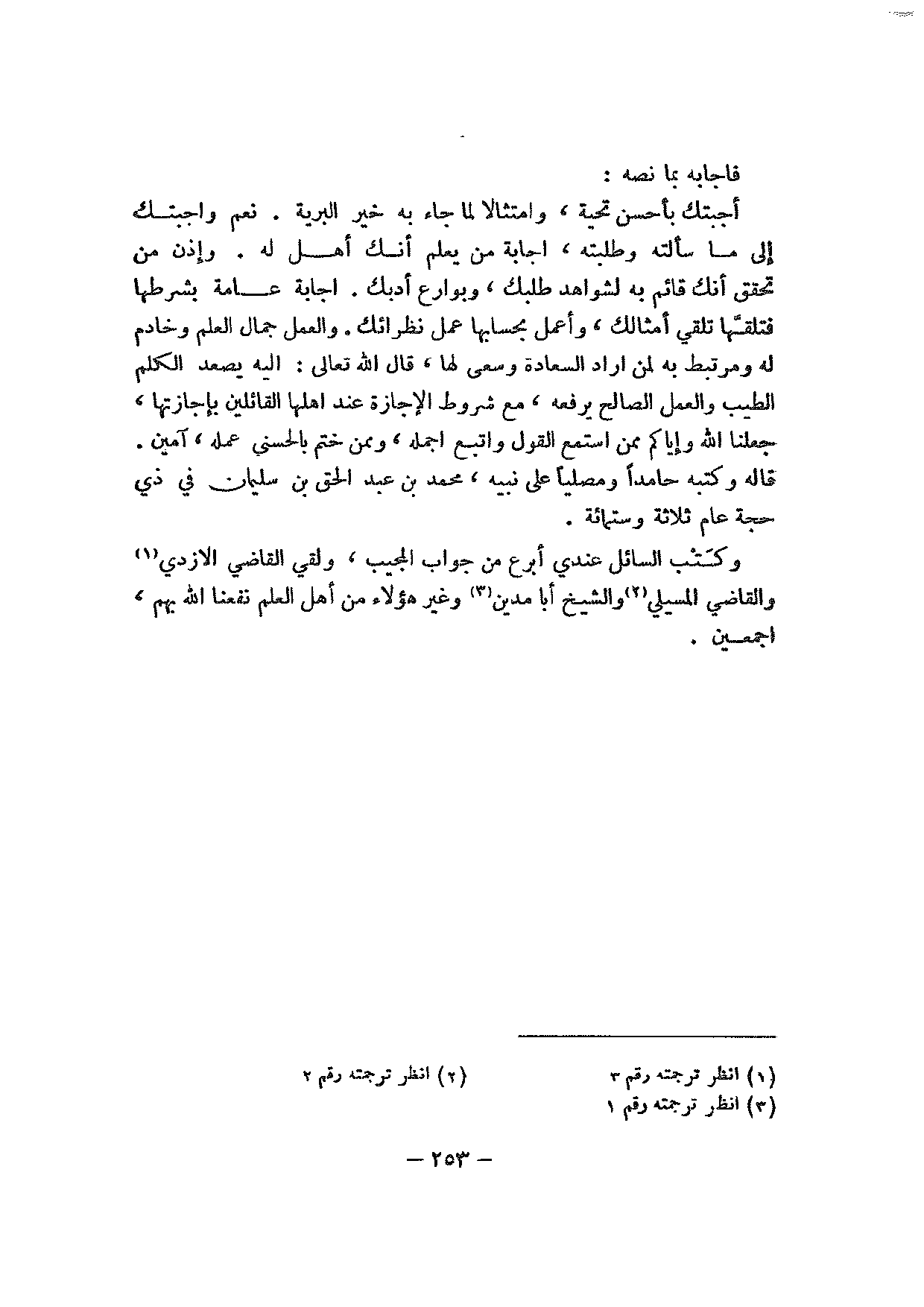 أجبتك بأحسن تحية، وامتثالا لما جاء به خير البرية. نعم وأجبتك إلى ما سألته وطلبته، إجابة من يعلم أنك أهل له. وإذن من تحقق أنك قائم به لشواهد طلبك، وبوارع أدبك. إجابة عامة بشرطها فتلقها تلقي أمثالك، وأعمل بحسبها عمل نظرائك. والعمل جمال العلم وخادم له ومرتبط به لمن أراد السعادة وسعى لها، قال الله تعالى: إليه يصعد الكلم الطيب والعمل الصالح يرفعه، مع شروط الإجازة عند أهلها القائلين بإجازتها، جعلنا الله وإياكم ممن استمع القول واتبع أجمله، وممن ختم بالحسنى عمله، آمين. قاله وكتبه حامدا ومصليا على نبيه، محمد بن عبد الحق بن سليمان في ذي حجة عام ثلاثة وستمائة.