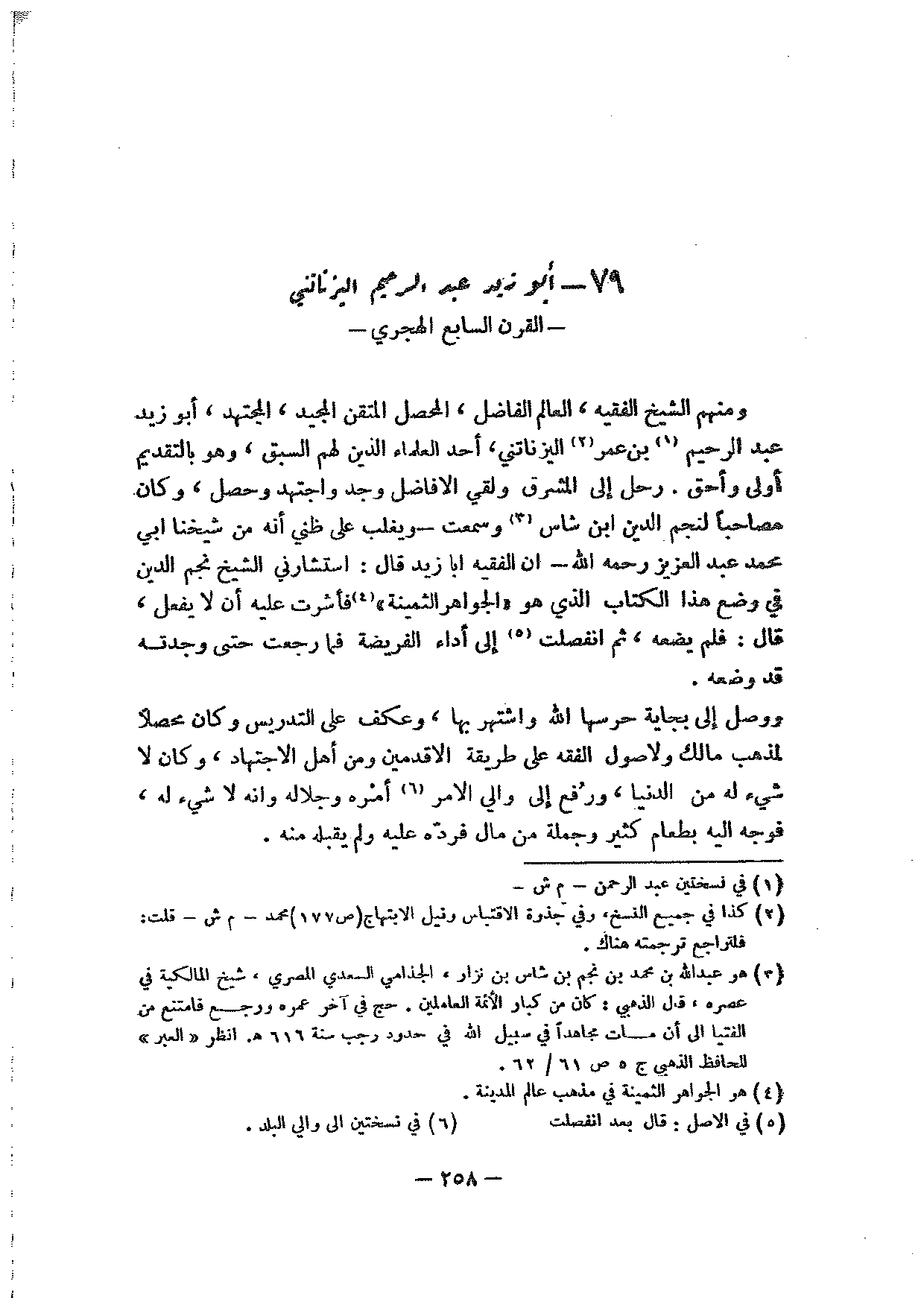 ومنهم الشيخ الفقيه، العالم الفاضل، المحصل المتقن المجيد، المجتهد، أبو زيد عبد الرحيم بن عمر اليزناتني، أحد العلماء الذين لهم السبق، وهو بالتقديم أولى وأحق. رحل إلى المشرق ولقي الأفاضل وجد واجتهد وحصل، وكان مصاحبا لنجم الدين ابن شاس وسمعت -ويغلب على ظني إنه من شيخنا أبي محمد عبد العزيز رحمه الله- أن الفقيه أبا زيد قال: استشاري الشيخ نجم الدين في وضع هذا الكتاب الذي هو "الجواهر الثمينة" فأشرت عليه أن لا يفعل، قال: فلم يضعه، ثم انفصلت إلى أداء الفريضة فما رجعت حتى وجدته قد وضعه.