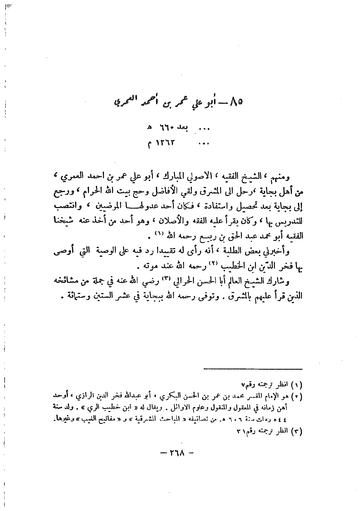 ومنهم، الشيخ الفقيه، الأصولي المبارك، أبو علي عمر بن أحمد العمري، من أهل بجاية، رحل إلى المشرق ولقي الأفاضل وحج بيت الله الحرام، ورجع إلى بجاية بعد تحصيل واستفادة، فكان أحد عدولها المرضيين، وانتصب للتدريس بها، وكان يقرأ عليه الفقه والأصلان، وهو أحد من أخذ عنه شيخنا الفقيه أبو محمد عبد الحق بن ربيع رحمه الله.