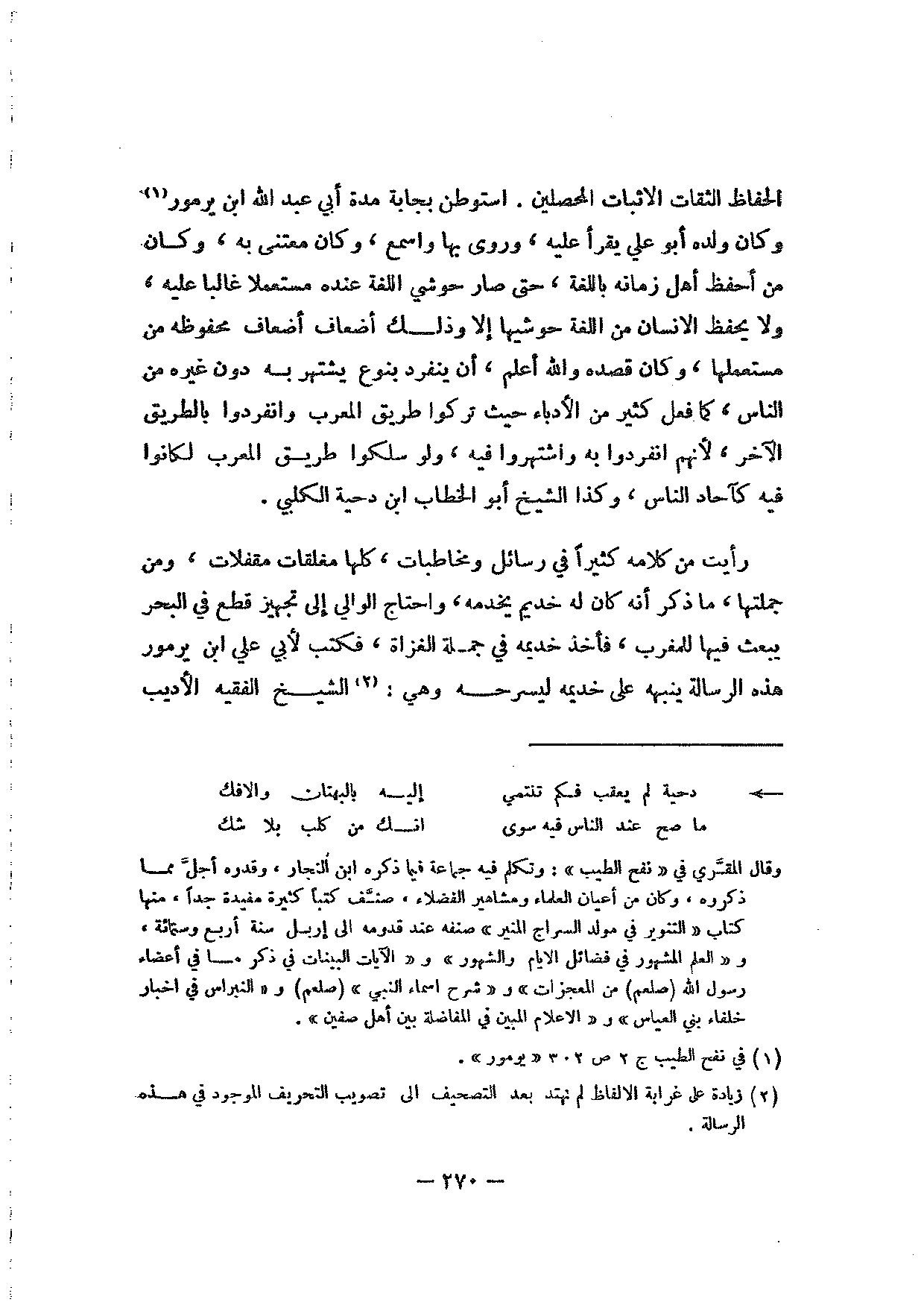 الحفاظ الثقات الإثبات المحصلين. استوطن بجاية مدة أبي عبد الله ابن يرمور وكان ولده أبو علي يقرأ عليه، وروى بها واسمع، وكان معتنى به، وكان من أحفظ أهل زمانه باللغة، حتى صار حوشي اللغة عنده مستعملا غالبا عليه، ولا يحفظ الإنسان من اللغة حوشيها إلا وذلك أضعاف محفوظه من مستعملها، وكان قصده والله أعلم، أن ينفرد بنوع يشتهر به دون غيره من الناس، كما فعل كثير من الأدباء حيث تركوا طريق المعرب وانفردوا بالطريق الآخر، لأنهم انفردوا به واشتهروا فيه، ولو سلكوا طريق المعرب لكانوا فيه كآحاد الناس، وكذا الشيخ أبو الخطاب ابن دحية الكلبي.