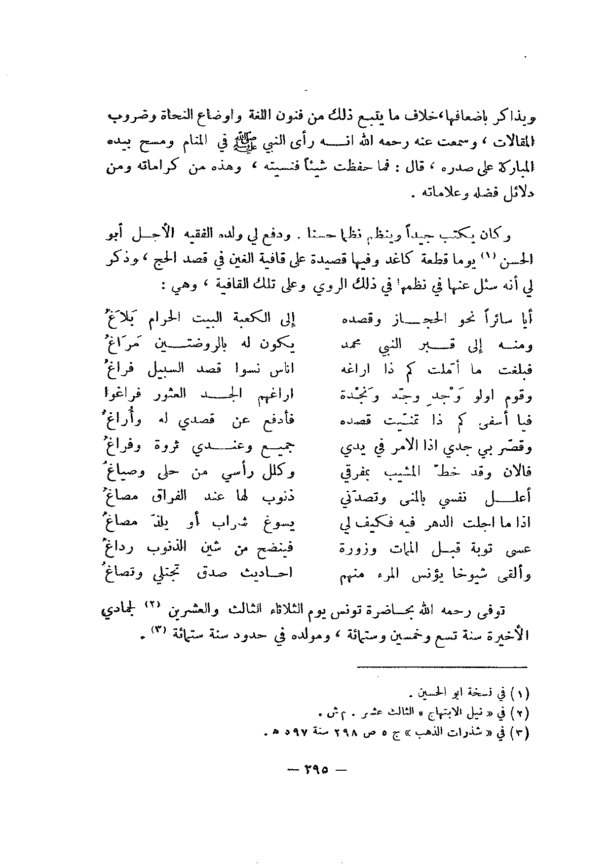 ويذاكر بأضعافها، خلاف ما يتبع ذلك من فنون اللغة وأوضاع النحاة وضروب المقالات، وسمعت عنه رحمه الله إنه رأى النبي صلى الله عليه وسلم في المنام ومسح بيده المباركة على صدره، قال: فما حفظت شيئا فنسيته، وهذه من كراماته ومن دلائل فضله وعلاماته.