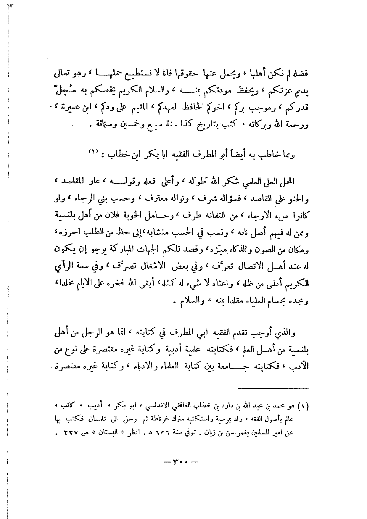 ومما خاطب به أيضا أبو المطرف الفقيه أبا بكر ابن خطاب: المحل العلى العلمي شكر الله طوله، وأعلى فعله وقوله، علو المقاصد، والحنو على المقاصد، فسؤاله شرف، ونواله معترف، وحسب بني الرجاء، ولو كانوا ملء الأرجاء، من التفاته طرف، وحامل الخوبة فلان من أهل بلنسية وممن له فيهم أصل نابه، ونسب في الحسب متشابه، إلى حظ من الطلب أحرزه، ومكان من الصون والذكاء ميزه، وقصد تلكم الجهات المباركة يرجو أن يكون له عند أهل الاتصال تعرف، وفي بعض الأشغال تصرف، وفي سعة الرأي الكريم أدنى من ظله، واعتاه لا شيء له كمثله، أبقى الله فخره على الأيام مخلدا، ومجده بحسام العلياء مقلدا بمنه، والسلام.