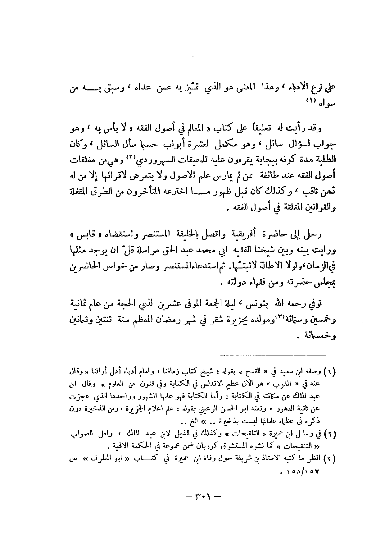 وقد رأيت له تعليقا على كتاب "المعالم في أصول الفقه" لا بأس به، وهو جواب لسؤال سائل، وهو مكمل لعشرة أبواب حسبما سأل السائل، وكان الطلبة مدة كونه ببجاية يقرءون عليه تلحيقات السهروردي وهي من مغلقات أصول الفقه عند طائفة ممن لم يمارس علم الأصول ولا يتعرض لإقرائها إلا من له ذهن ثاقب، وكذلك كان قبل ظهور ما اخترعه المتأخرون من الطرق المقفلة والقوانين المغلقة في أصول الفقه.