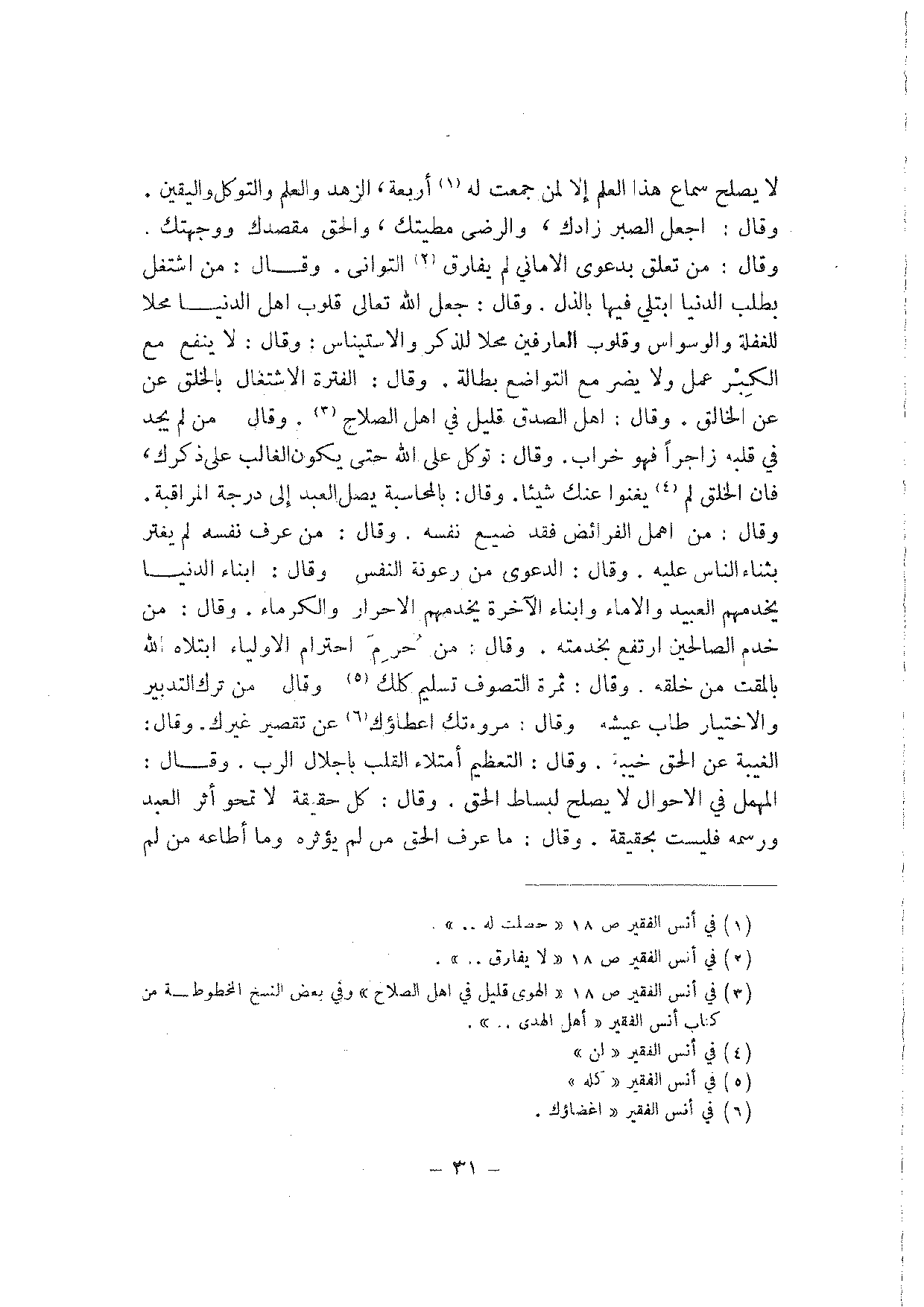لا يصلح سماع هذا العلم إلا لمن جمعت له أربعة، الزهد والعلم والتوكل واليقين. وقال: اجعل الصبر زادك، والرضى مطيتك، والحق مقصدك ووجهتك. وقال: من تعلق بدعوى الأماني لم يفارق التوانى. وقال: من اشتغل بطلب الدنيا ابتلي فيها بالذل. وقال: جعل الله تعالى قلوب أهل الدنيا محلا للغفلة والوسواس وقلوب العارفين محلا للذكر والاستيناس: وقال: لا ينفع مع الكبر عمل ولا يضر مع التواضع بطالة. وقال: الفترة الاشتغال بالخلق عن الخالق. وقال: أهل الصدق قليل في أهل الصلاح. وقال من لم يجد في قلبه زاجرا فهو خراب. وقال: توكل على الله حتى يكون الغالب على ذكرك، فإن الخلق لم يغنوا عنك شيئا. وقال: بالمحاسبة يصل العبد إلى درجة المراقبة. وقال: من أهمل الفرائض فقد ضيع نفسه. وقال: من عرف نفسه لم يغتر بثناء الناس عليه. وقال: الدعوى من رعونة النفس وقال: أبناء الدنيا يخدمهم العبيد والإماء وأبناء الآخرة يخدمهم الأحرار والكرماء. وقال: من خدم الصالحين ارتفع بخدمته. وقال: من حرم احترام الأولياء ابتلاه الله بالمقت من خلقه. وقال: ثمرة التصوف تسليم كلك وقال من ترك التدبير والاختيار طاب عيشه. وقال: مروءتك إعطاؤك عن تقصير غيرك. وقال: الغيبة عن الحق خيبة. وقال: التعظيم امتلاء القلب بإجلال الرب. وقال: المهمل في الأحوال لا يصلح لبساط الحق. وقال: كل حقيقة لا تمحو أثر العبد ورسمه فليست بحقيقة. وقال: ما عرف الحق من لم يؤثره وما أطاعه من لم