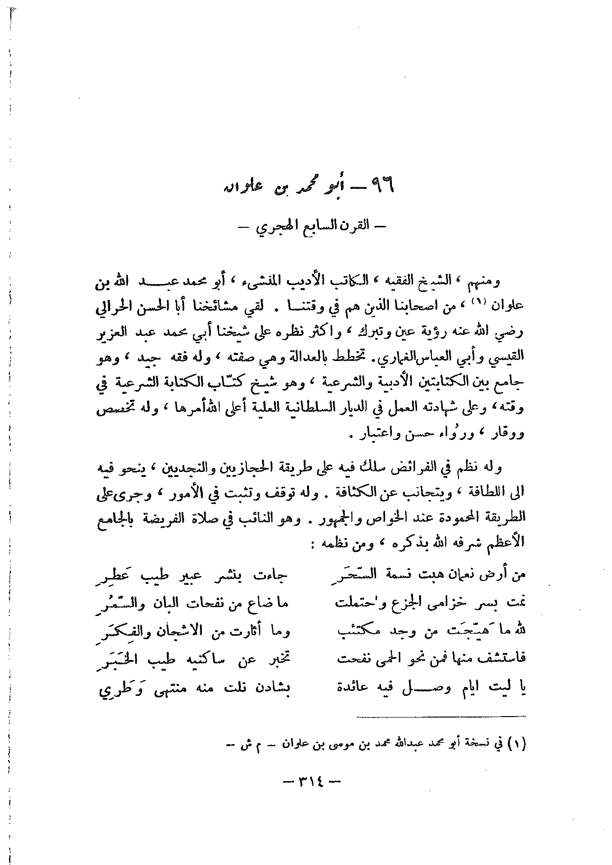 ومنهم، الشيخ الفقيه، الكاتب الأديب المنشئ، أبو محمد عبد الله بن علوان، من أصحابنا الذين هم في وقتنا. لقي مشائخنا أبا الحسن الحرالي رضي الله عنه رؤية عين وتبرك، وأكثر نظره على شيخنا أبي محمد عبد العزيز القيسي وأبي العباس الغماري. تخطط بالعدالة وهي صفته، وله فقه جيد، وهو جامع بين الكتابتين الأدبية والشرعية، وهو شيخ كتاب الكتابة الشرعية في وقته، وعلى شهادته العمل في الديار السلطانية العلية أعلى الله أمرها، وله تخصص ووقار، ورواء حسن واعتبار.