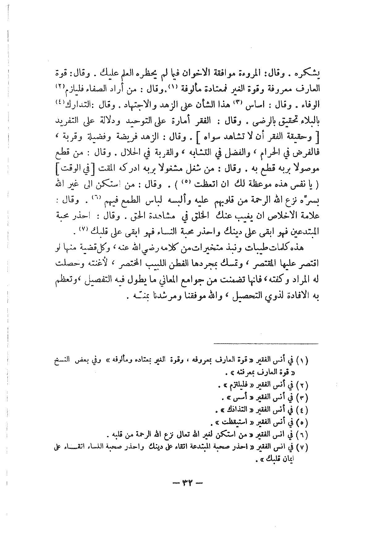 يشكره. وقال المروءة موافقة الإخوان فيما لم يحظره العلم عليك. وقال: قوة العارف معروفة وقوة الغير فمعتادة مألوفة. وقال: من أراد الصفاء فليلزم الوفاء. وقال: أساس هذا الشأن على الزهد والاجتهاد. وقال: التدارك بالبلاء تحقيق بالرضى. وقال: الفقر أمارة على التوحيد ودلالة على التفريد [وحقيقة الفقر أن لا تشاهد سواه]. وقال: الزهد فريضة وفضيلة وقربة، فالفرض في الحرام، والفضل في التشابه، والقربة في الحلال. وقال: من قطع موصولا بربه قطع به. وقال: من شغل مشغولا بربه أدركه المقت [في الوقت] (يا نفس هذه موعظة لك أن اتعظت). وقال: من استكن إلى غير الله بسره نزع الله الرحمة من قلوبهم عليه وأليسه لباس الطمع فيهم. وقال: علامة الإخلاص أن يغيب عنك الخلق في مشاهدة الحق. وقال: احذر محبة المبتدعين فهو أبقى على دينك واحذر محبة النساء فهو أبقى على قلبك.