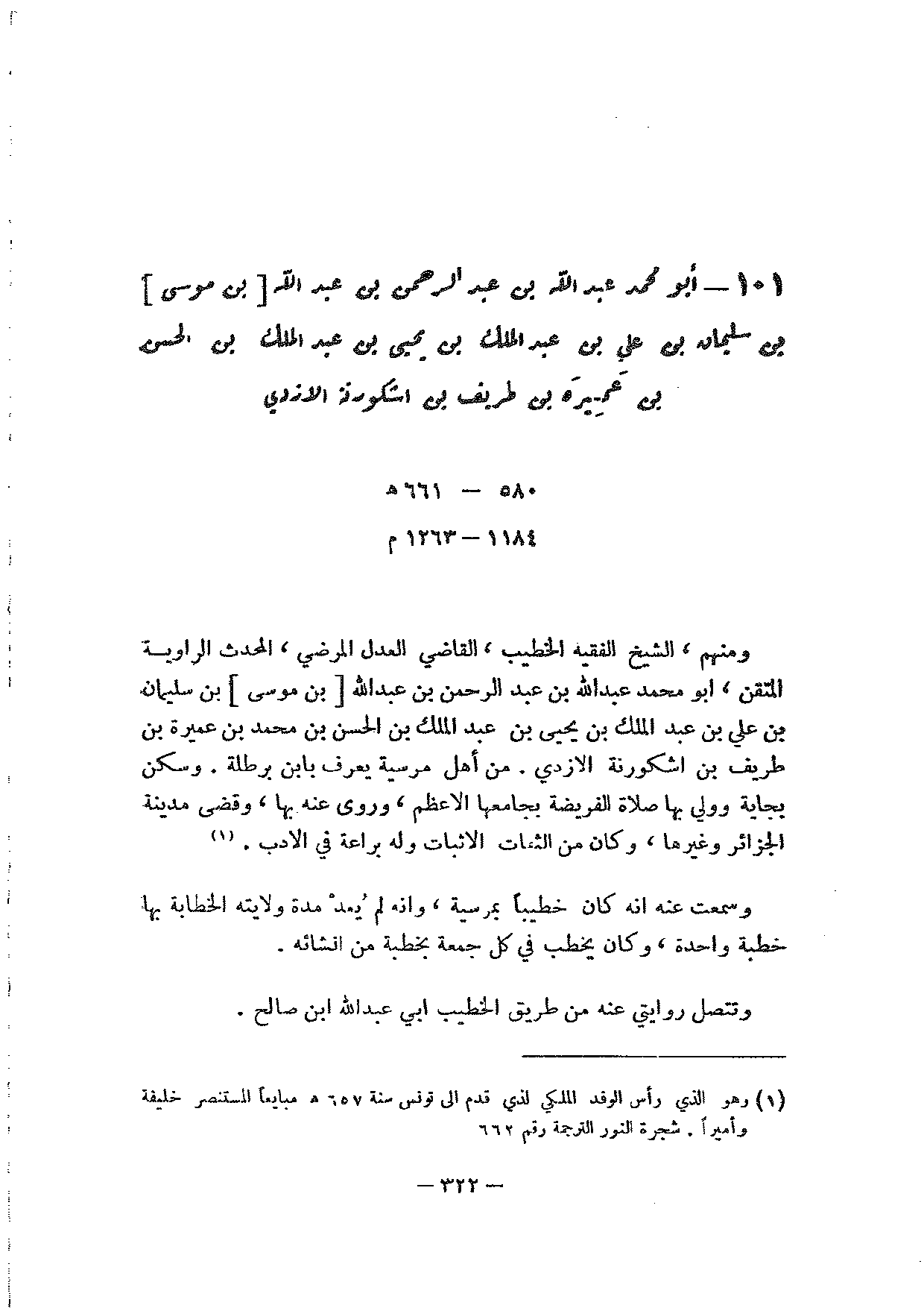 101 - أبو محمد عبد الله بن عبد الرحمن بن عبد الله [بن موسى] بن سليمان بن علي بن عبد الملك بن يحيى بن عبد الملك بن الحسن بن عميرة بن طريف بن اشكورنة الازدي