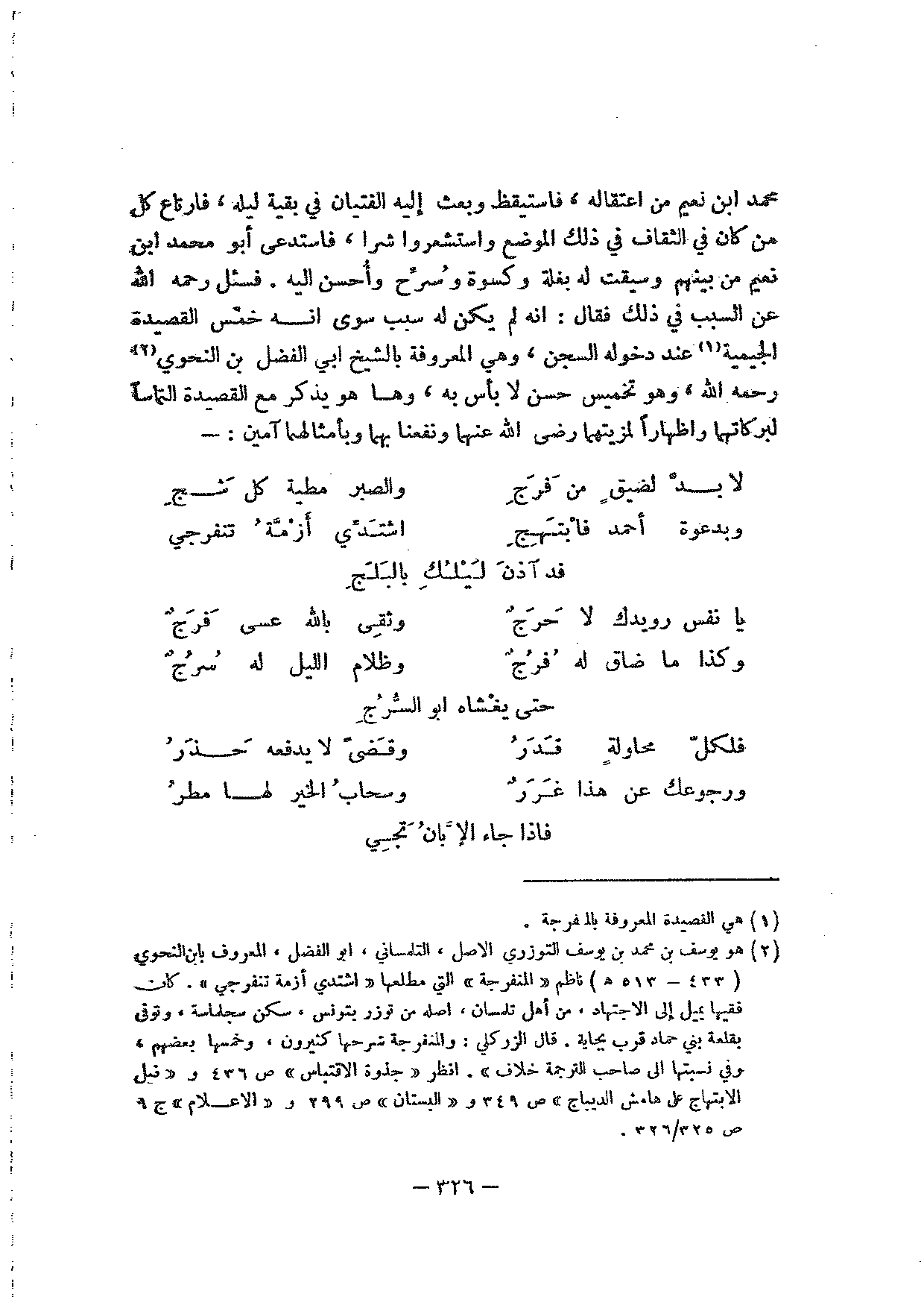 محمد ابن نعيم من اعتقاله، فاستيقظ وبعث إليه الفتيان في بقية ليله، فارتاع كل من كان في الثقاف في ذلك الموضع واستشعروا شرا، فاستدعى أبو محمد ابن نعيم من بينهم وسيقت له بغلة وكسوة وسرح وأحسن إليه. فسئل رحمه الله عن السبب في ذلك فقال: إنه لم يكن له سبب سوى إنه خمس القصيدة الجيمية عند دخوله السجن، وهي المعروفة بالشيخ أبي الفضل بن النحوي رحمه الله، وهو تخميس حسن لا بأس به، وها هو يذكر مع القصيدة التماسا لبركاتهما وإظهارا لمزيتهما رضي الله عنهما ونفعنا بهما وبأمثالهما آمين:-