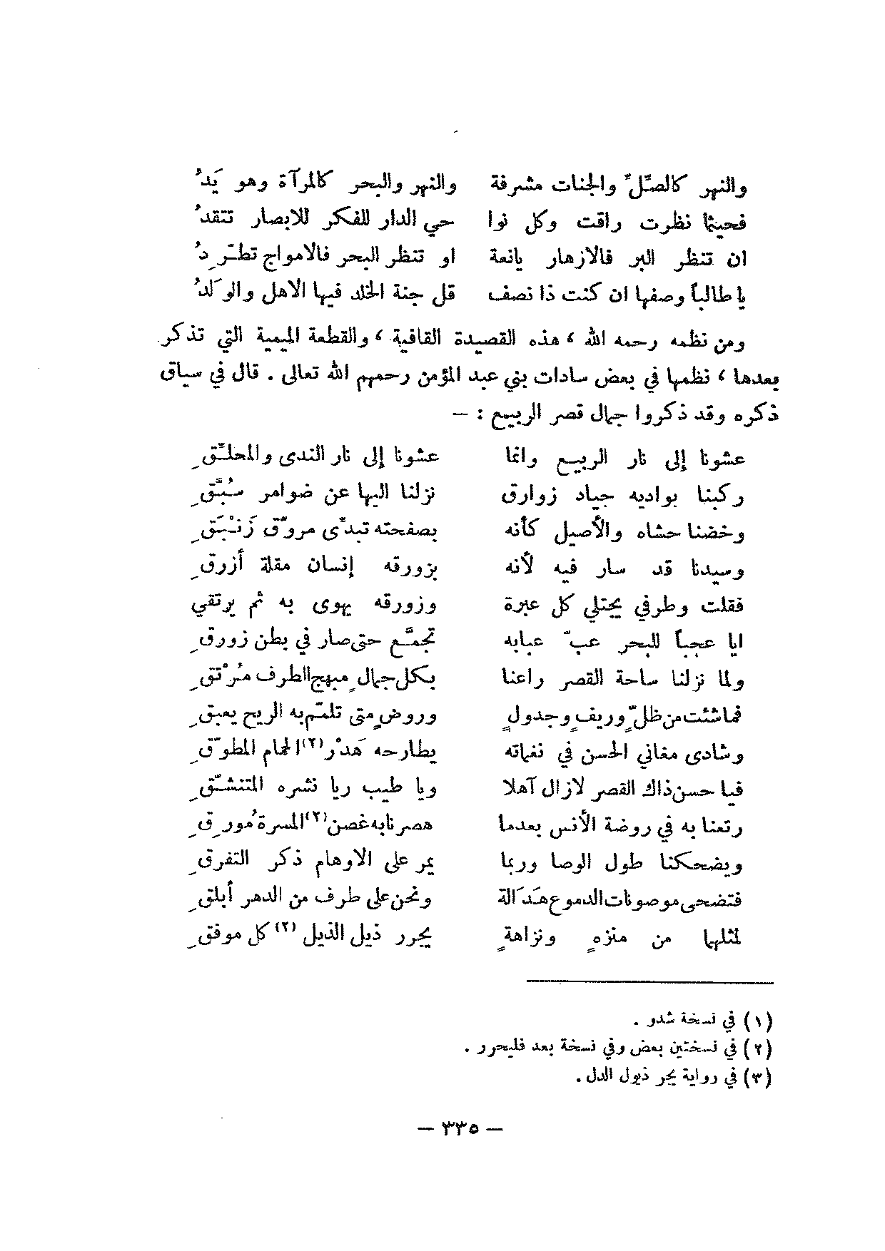 ومن نظمه رحمه الله، هذه القصيدة القافية، والقطعة الميمية التي تذكر بعدها، نظمها في بعض سادات بني عبد المؤمن رحمهم الله تعالى. قال في سياق ذكره وقد ذكروا جمال قصر الربيع:-