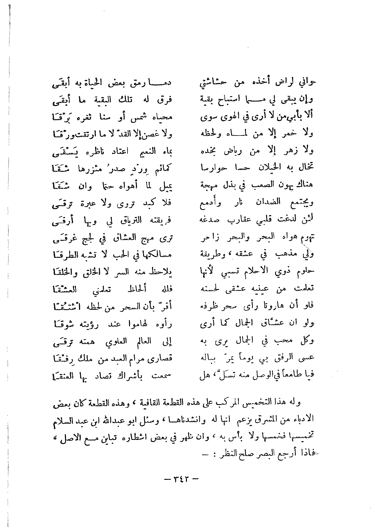 وله هذا التخميس المركب على هذه القطعة القافية، وهذه القطعة كان بعض الأدباء من المشرق يزعم أنها له وأنشدناها، وسئل أبو عبد الله ابن عبد السلام تخميسها فخمسها ولا بأس به، وان ظهر في بعض أشطاره تباين مع الأصل، فإذا أرجع البصر صلح النظر:-