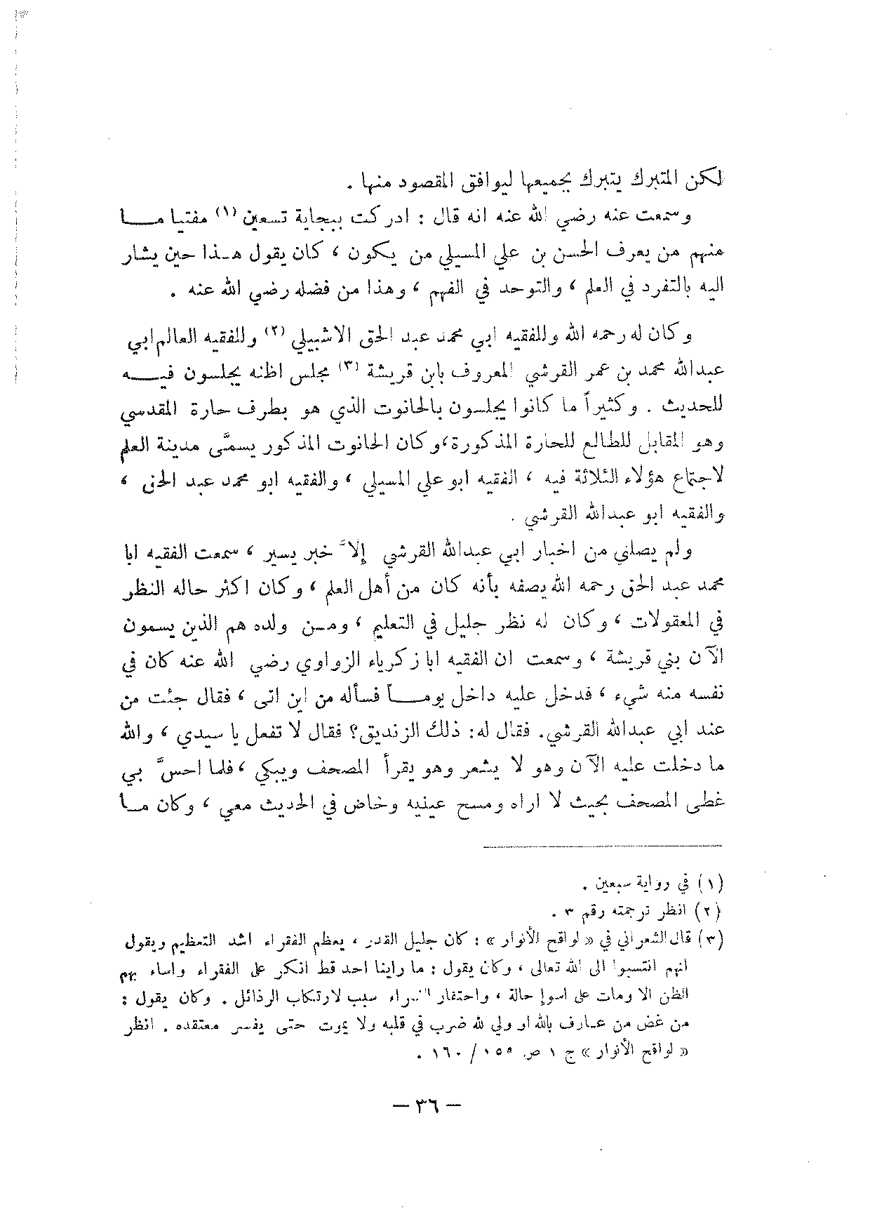 ولم يصلني من أخبار أبي عبد الله القرشي إلا خبر يسير، سمعت الفقيه أبا محمد عبد الحق رحمه الله يصفه بأنه كان من أهل العلم، وكان أكثر حاله النظر في المعقولات، وكان له نظر جليل في التعليم، ومن ولده هم الذين يسمون الآن بني قريشة، وسمعت أن الفقيه أبا زكرياء الزواوي رضي الله عنه كان في نفسه منه شيء، فدخل عليه داخل يوما فسأله من أين أتى، فقال جئت من عند أبي عبد الله القرشي. فقال له: ذلك الزنديق؟ فقال لا تفعل يا سيدي، والله ما دخلت عليه الآن وهو لا يشعر وهو يقرأ المصحف ويبكي، فلما أحس بي غطى المصحف بحيث لا أراه ومسح عينيه وخاض في الحديث معي، وكان ما