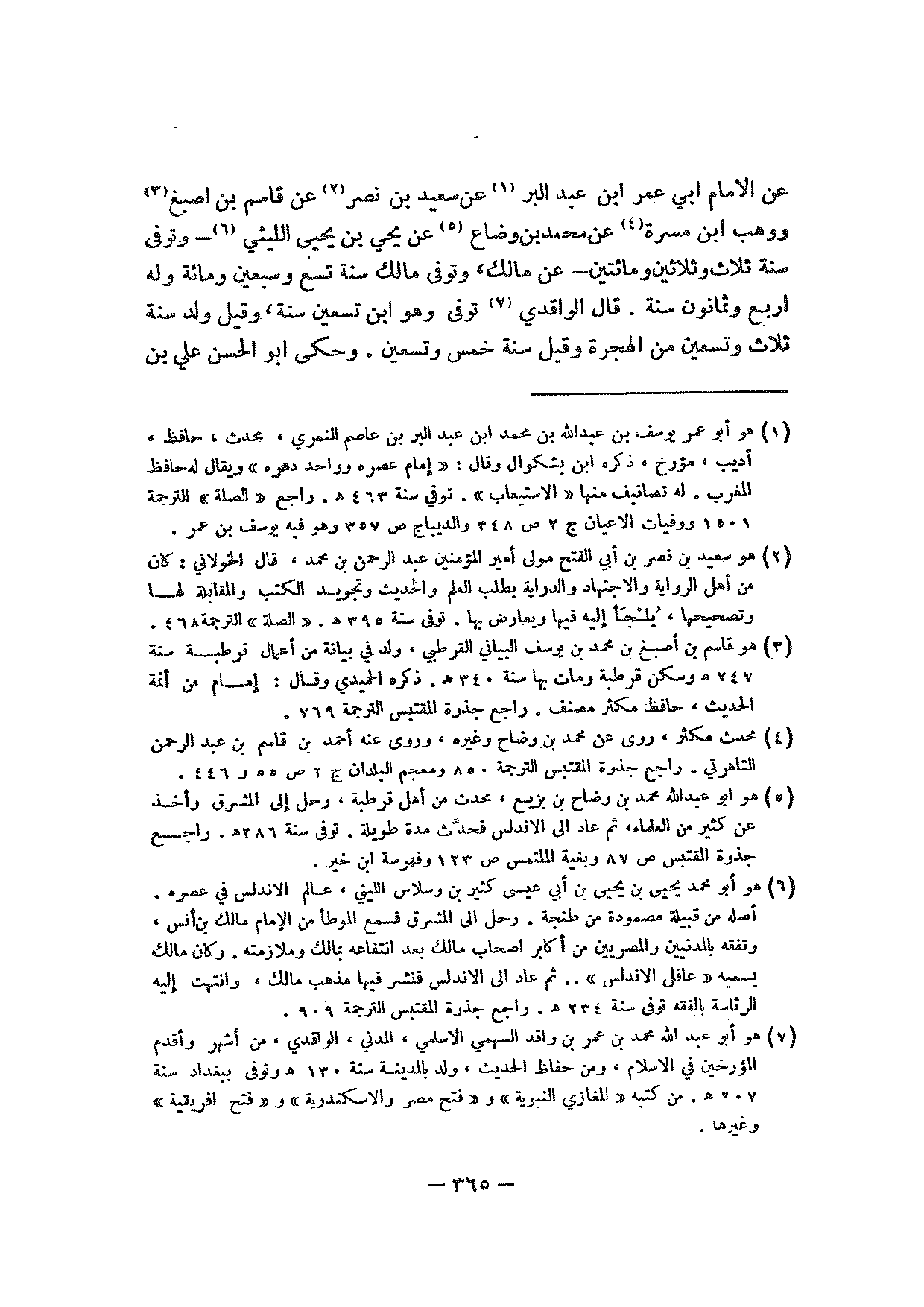 عن الإمام أبي عمر ابن عبد البر عن سعيد بن نصر عن قاسم بن اصبغ ووهب ابن مسرة عن محمد بن وضاع عن يحي بن يحيى الليثي -وتوفي سنة ثلاث وثلاثين ومائتين- عن مالك، وتوفي مالك سنة تسع وسبعين ومائة وله أربع وثمانون سنة. قال الواقدي توفي وهو ابن تسعين سنة، وقيل ولد سنة ثلاث وتسعين من الهجرة وقيل سنة خمس وتسعين. وحكى أبو الحسن علي بن