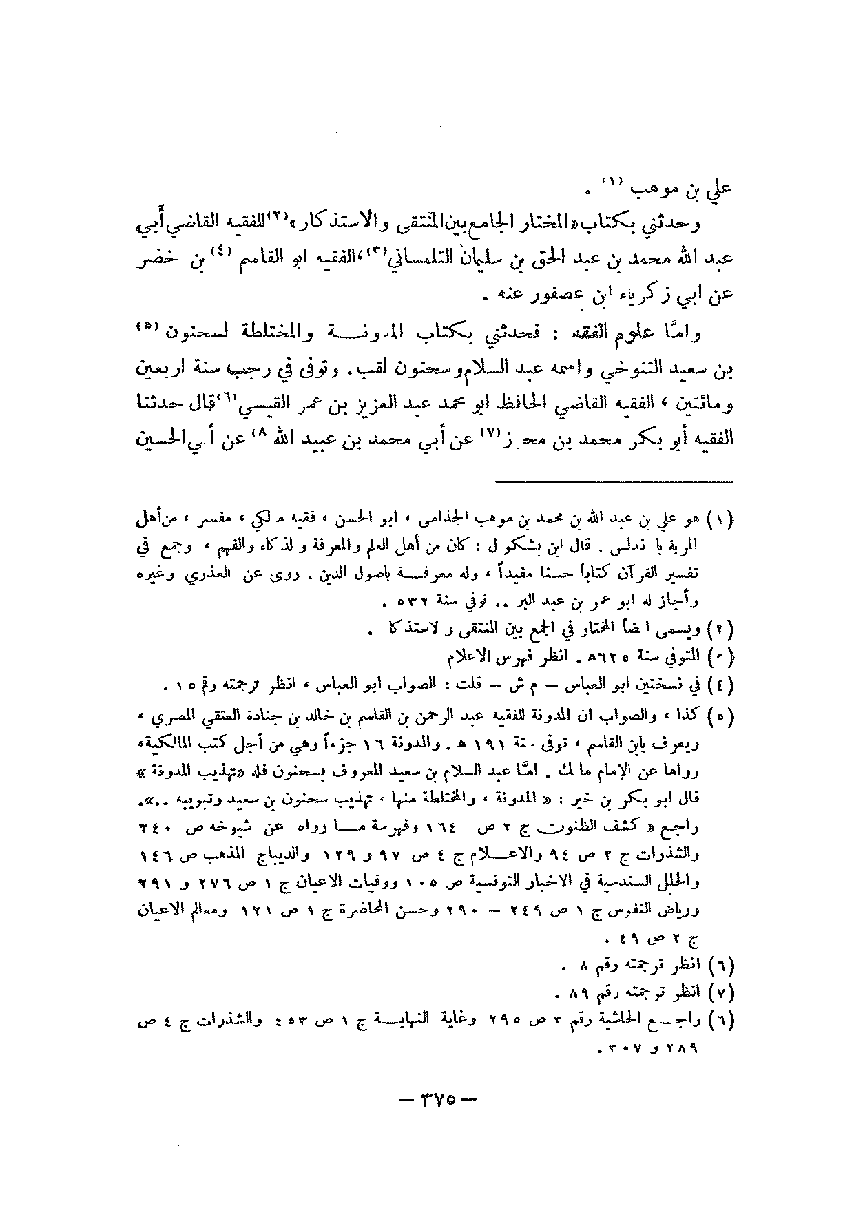 وأما علوم الفقه: فحدثني بكتاب المعونة والمختلطة لسحنون بن سعيد التنوخي واسمه عبد السلام وسحنون لقب. وتوفي في رجب سنة أربعين ومائتين، الفقيه القاضي الحافظ أبو محمد عبد العزيز بن عمر القيسي قال حدثنا الفقيه أبو بكر محمد بن محرز عن أبي محمد بن عبيد الله عن أبي الحسين