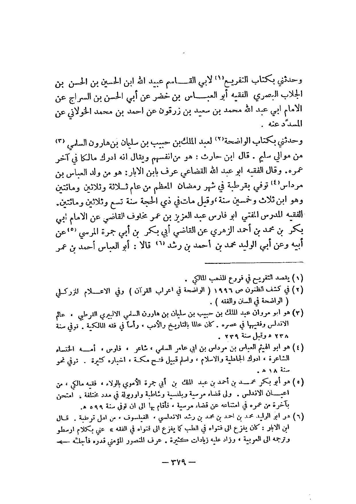 وحدثني بكتاب الواضحة لعبد الملك بن حبيب بن سليمان بن هارون السلمي من موالي سليم. قال ابن حارث: هو من أنفسهم ويقال إنه أدرك مالكا في آخر عمره. وقال الفقيه أبو عبد الله القضاعي عرف بابن الابار: هو من ولد العباس بن مرداس توفي بقرطبة في شهر رمضان المعظم من عام ثلاثة وثلاثين ومائتين وهو ابن ثلاث وخمسين سنة، وقيل مات في ذي الحجة سنة تسع وثلاثين ومائتين. الفقيه المدرس المفتي أبو فارس عبد العزيز بن عمر مخلوف القاضي عن الإمام أبي بكر بن محمد بن أحمد الزهري عن القاضي أبي بكر بن أبي جمرة المرسي عن أبيه وعن أبي الوليد محمد بن أحمد بن رشد قالا: أبو العباس أحمد بن عمر