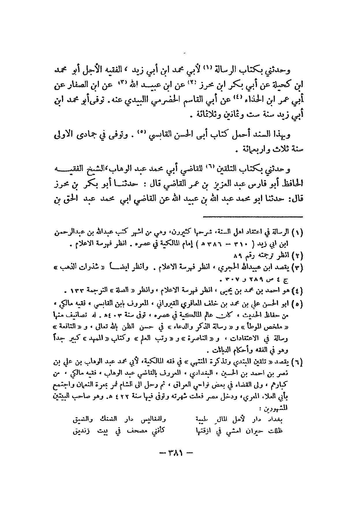 وحدثني بكتاب التلقين للقاضي أبي محمد عبد الوهاب، الشيخ الفقيه الحافظ أبو فارس عبد العزيز بن عمر القاضي قال: حدثنا أبو بكر بن محرز قال: حدثنا أبو محمد عبد الله بن عبيد الله عن القاضي أبي محمد عبد الحق بن