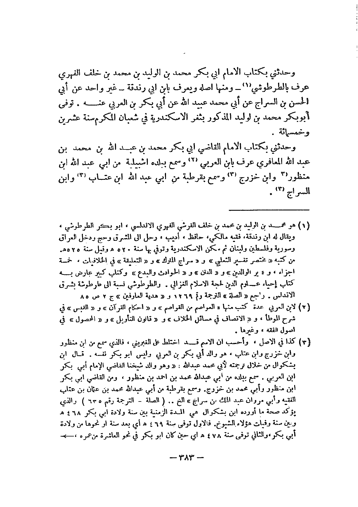وحدثني بكتاب الإمام أبي بكر محمد بن الوليد بن محمد بن خلف الفهري عرف بالطرطوشي -ومنها أصله ويعرف بابن أبي رندقة- غير واحد عن أبي الحسن بن السراج عن أبي محمد عبيد الله عن أبي بكر بن العربي عنه. توفي أبو بكر محمد بن الوليد المذكور بثغر الإسكندرية في شعبان المكرم سنة عشرين وخمسمائة.