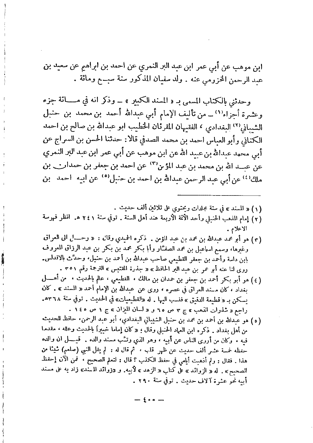 وحدثني بالكتاب المسمى ب"المسند الكبير" -وذكر إنه في مائة جزء وعشرة أجزاء (1) - من تأليف الإمام أبي عبد الله أحمد بن محمد بن حنبل الشيباني (2) البغدادي، الفقيهان المقرئان الخطيب أبو عبد الله بن صالح بن أحمد الكناني وأبو العباس أحمد بن محمد الصدفي قالا: حدثنا الحسن بن السراج عن أبي محمد عبد الله بن عبيد الله عن ابن موهب عن أبي عمر ابن عبد البر النمري عن عبد الله بن محمد بن عبد المؤمن (3) عن أحمد بن جعفر بن حمدان بن ملك (4) عن أبي عبد الرحمن عبد الله بن أحمد بن حنبل (5) عن أبيه أحمد بن