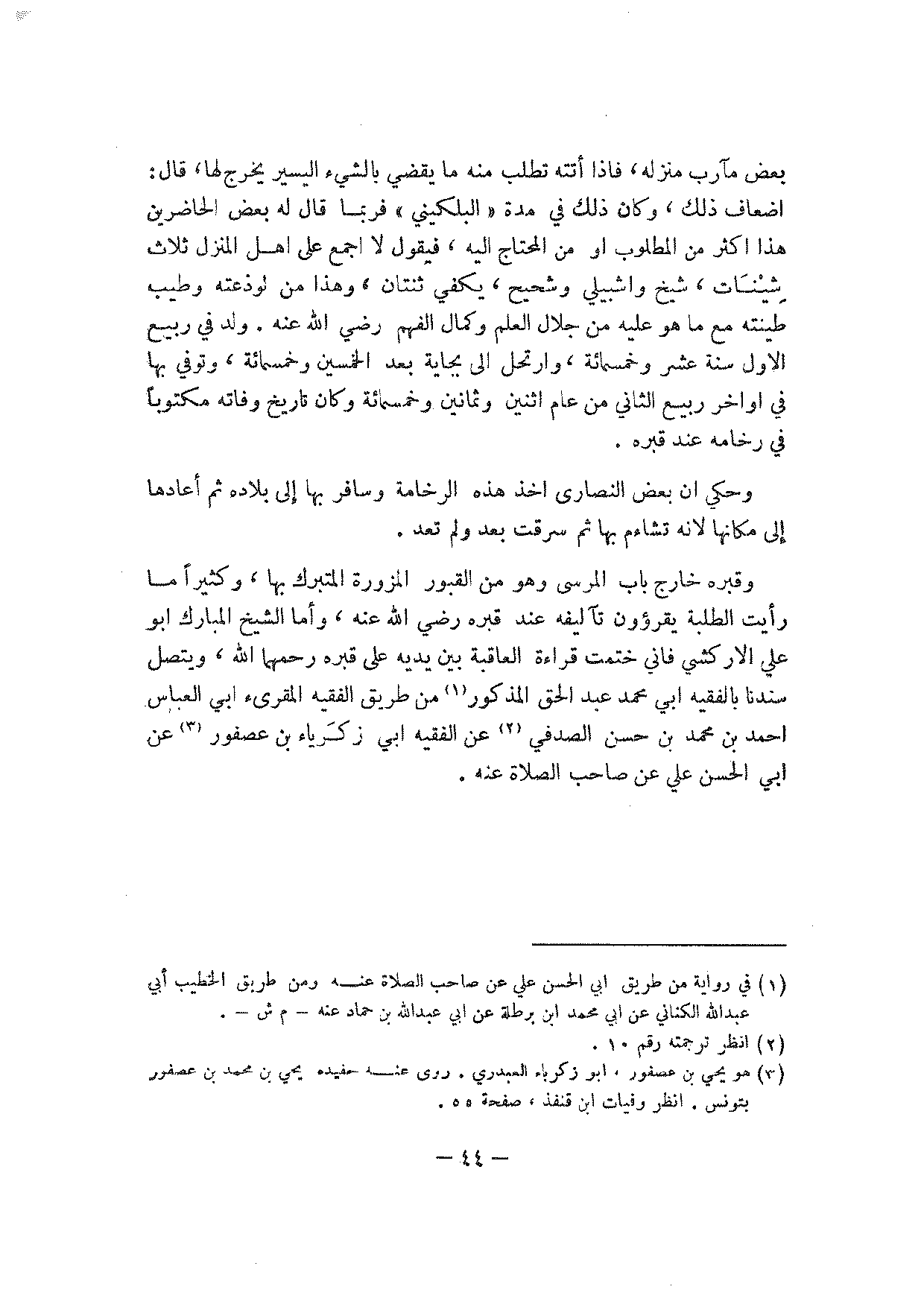 وقبره خارج باب المرسى وهو من القبور المزورة المتبرك بها، وكثيرا ما رأيت الطلبة يقرؤون تآليفه عند قبره رضي الله عنه، وأما الشيخ المبارك أبو علي الاركشي فاني ختمت قراءة العاقبة بين يديه على قبره رحمهما الله، ويتصل سندنا بالفقيه أبي محمد عبد الحق المذكور من طريق الفقيه المقرئ أبي العباس أحمد بن محمد بن حسن الصدفي عن الفقيه أبي زكرياء بن عصفور عن أبي الحسن علي عن صاحب الصلاة عنه.
