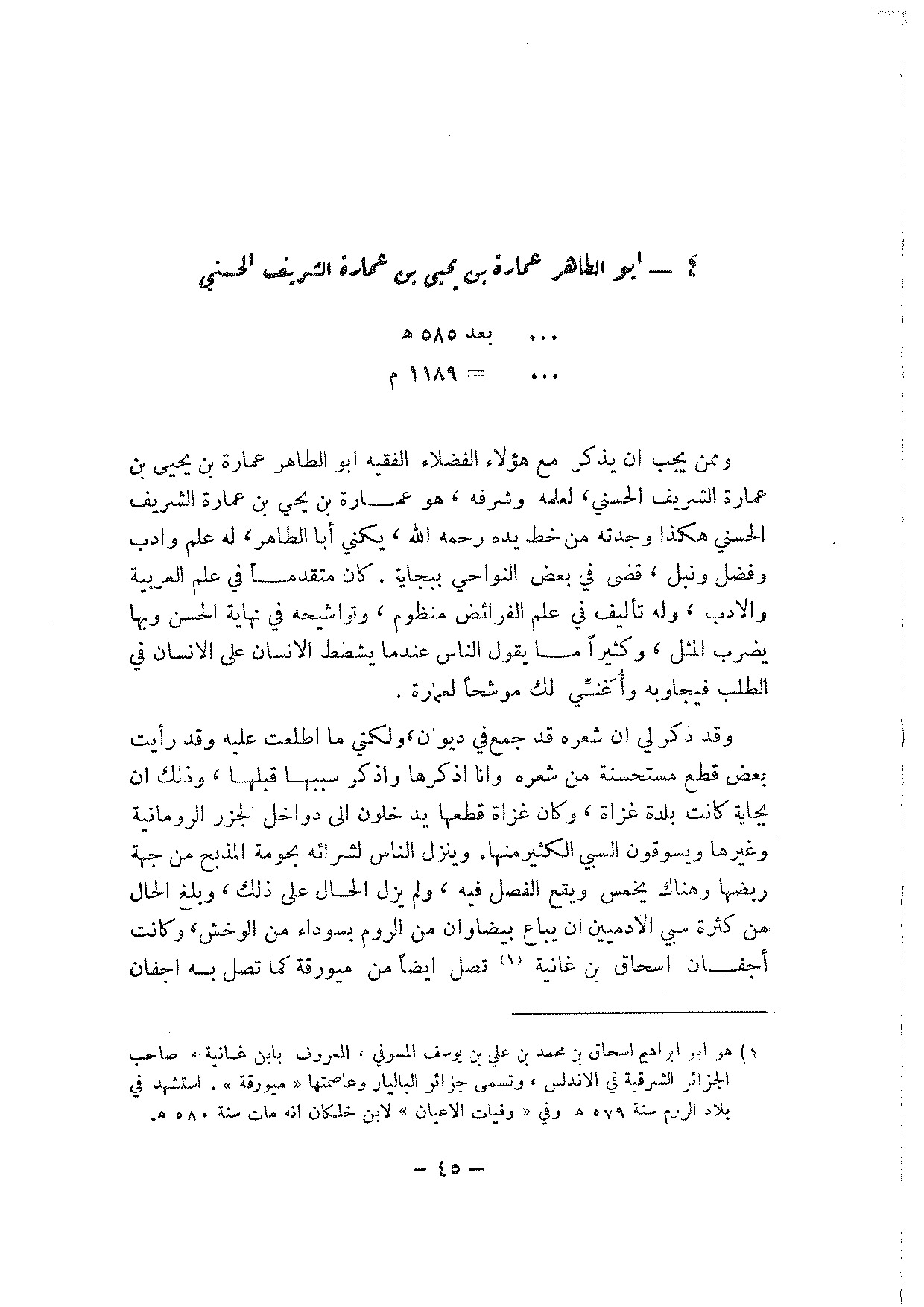 وممن يجب أن يذكر مع هؤلاء الفضلاء الفقيه أبو الطاهر عمارة بن يحيى بن عمارة الشريف الحسني، لعلمه وشرفه، هو عمارة بن يحيى بن عمارة الشريف الحسني هكذا وجدته من خط يده رحمه الله، يكني أبا الطاهر، له علم وأدب وفضل ونبل، قضى في بعض النواحي ببجاية. كان متقدما في علم العربية والأدب، وله تأليف في علم الفرائض منظوم، وتواشيحه في نهاية الحسن وبها يضرب المثل، وكثيرا ما يقول الناس عندما يشطط الإنسان على الإنسان في الطلب فيجاوبه وأغني لك موشحا لعمارة.