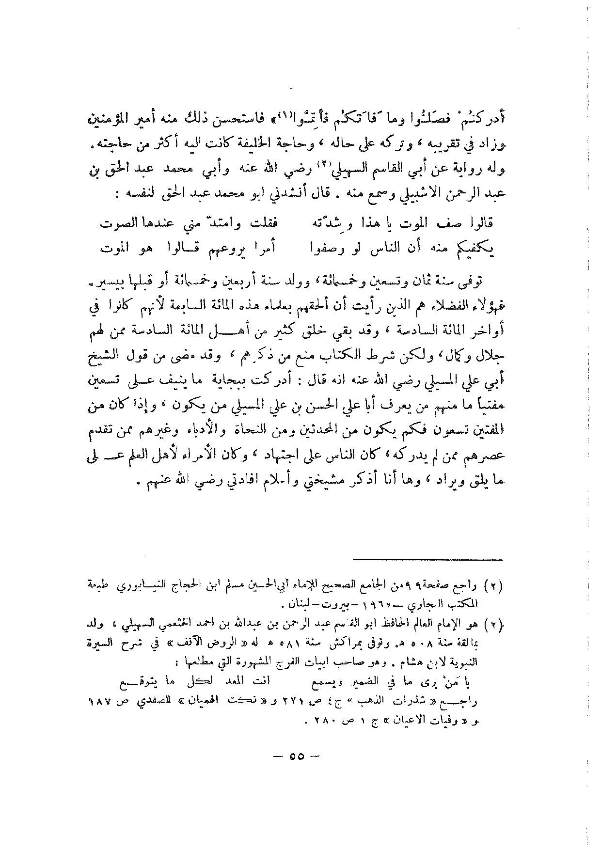 أدركتم فصلوا وما فاتكم فأتموا" فاستحسن ذلك منه أمير المؤمنين وزاد في تقريبه، وتركه على حاله، وحاجة الخليفة كانت إليه أكثر من حاجته. وله رواية عن أبي القاسم السهيلي رضي الله عنه وأبي محمد عبد الحق بن عبد الرحمن الاشبيلي وسمع منه. قال أنشدني أبو محمد عبد الحق لنفسه: