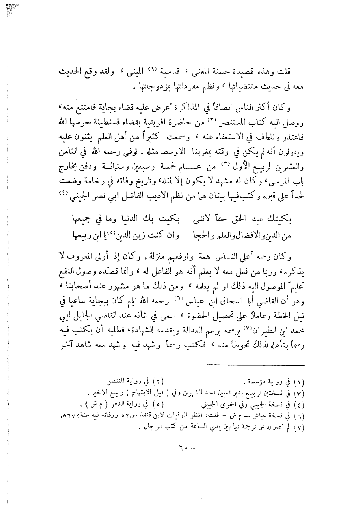 وكان أكثر الناس إنصافا في المذاكرة عرض عليه قضاء بجاية فامتنع منه، ووصل إليه كتاب المستنصر من حاضرة افريقية بقضاء قسنطينة حرسها الله فاعتذر وتلطف في الاستعفاء عنه، وسمعت كثيرا من أهل العلم يثنون عليه ويقولون إنه لم يكن في وقته بمغربنا الأوسط مثله. توفى رحمه الله في الثامن والعشرين لربيع الأول من عام خمسة وسبعين وستمائة ودفن بخارج باب المرسى، وكان له مشهد لا يكون إلا لمثله، وتاريخ وفاته في رخامة وضعت لحدا على قبره وكتب فيها بيتان هما من نظم الأديب الفاضل أبي نصر الجيني