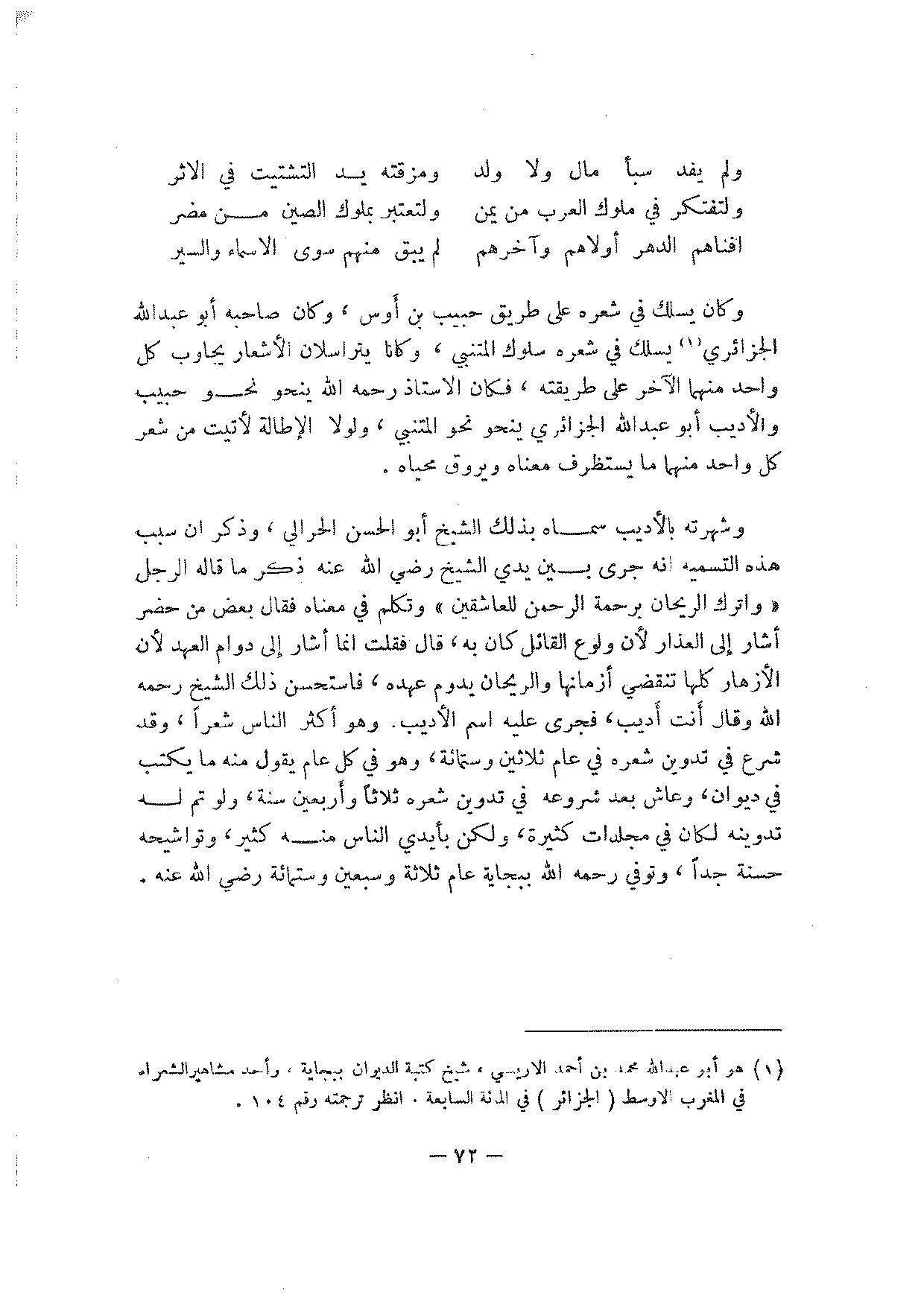 وكان يسلك في شعره على طريق حبيب بن أوس، وكان صاحبه أبو عبد الله الجزائري يسلك في شعره سلوك المتنبي، وكانا يتراسلان الأشعار يجاوب كل واحد منهما الآخر على طريقته، فكان الأستاذ رحمه الله ينحو نحو حبيب والأديب أبو عبد الله الجزائري ينحو نحو المتنبي، ولولا الإطالة لأتيت من شعر كل واحد منهما ما يستظرف معناه ويروق محياه.