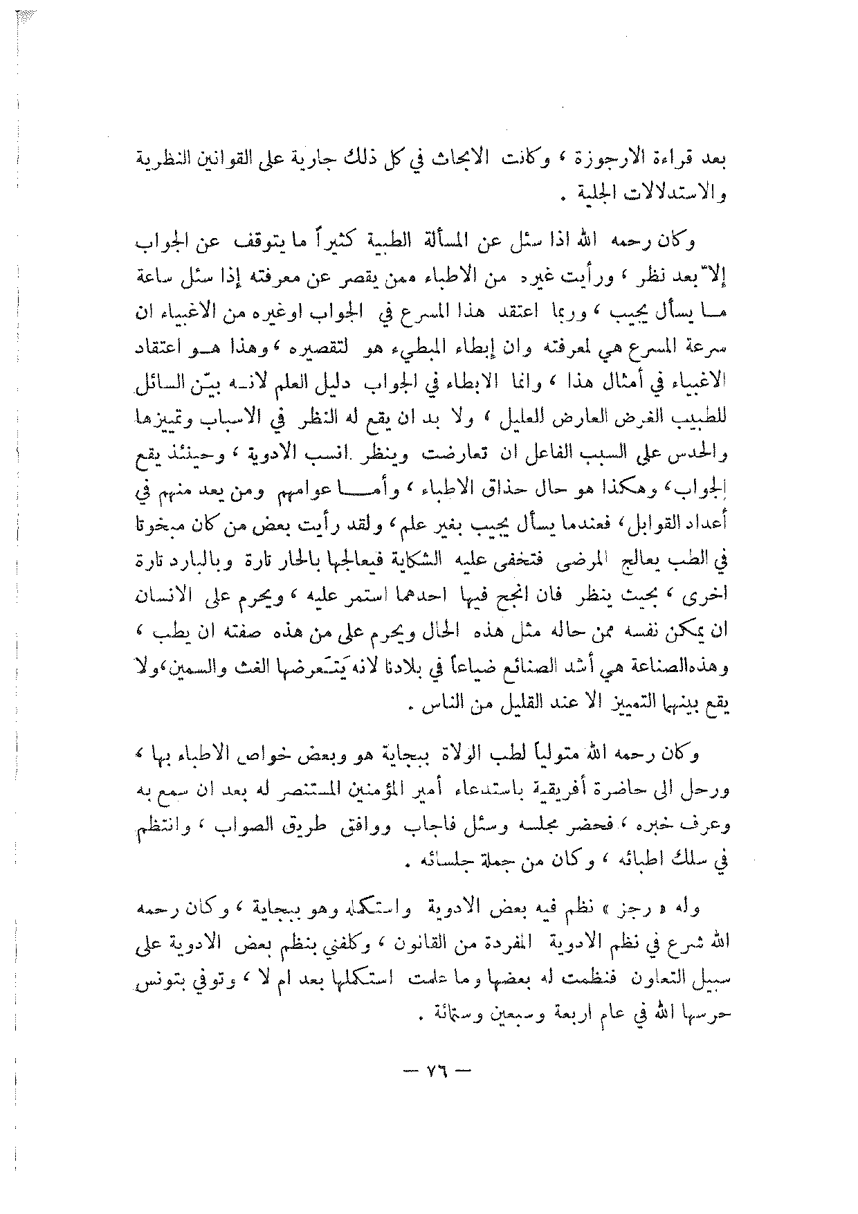 وكان رحمه الله إذا سئل عن المسألة الطبية كثيرا ما يتوقف عن الجواب إلا بعد نظر، ورأيت غيره من الأطباء ممن يقصر عن معرفته إذا سئل ساعة ما يسأل يجيب، وربما اعتقد هذا المسرع في الجواب أو غيره من الأغبياء أن سرعة المسرع هي لمعرفته وان إبطاء المبطئ هو لتقصيره، وهذا هو اعتقاد الأغبياء في أمثال هذا، وإنما الإبطاء في الجواب دليل العلم لأنه بين السائل للطبيب الغرض العارض للعليل، ولابد أن يقع له النظر في الأسباب وتمييزها والحدس على السبب الفاعل أن تعارض وينظر أنسب الأودية، وحينئذ يقع الجواب، وهكذا هو حال حذاق الأطباء، وأما عوامهم ومن يعد منهم في أعداد القوابل، فعندما يسأل يجيب بغير علم، ولقد رأيت بعض من كان مبخوتا في الطب يعالج المرضى فتخفى عليه الشكاية فيعالجها بالحار تارة وبالبارد تارة أخرى، بحيث ينظر فان انجح فيها احدهما استمر عليه، ويحرم على الإنسان أن يمكن نفسه ممن حاله مثل هذه الحال ويحرم على من هذه صفته أن يطب، وهذه الصناعة هي أشد الصنائع ضياعا في بلاده لأنه يتعرضها الغث والسمين، ولا يقع بينهما التمييز إلا عند القليل من الناس.