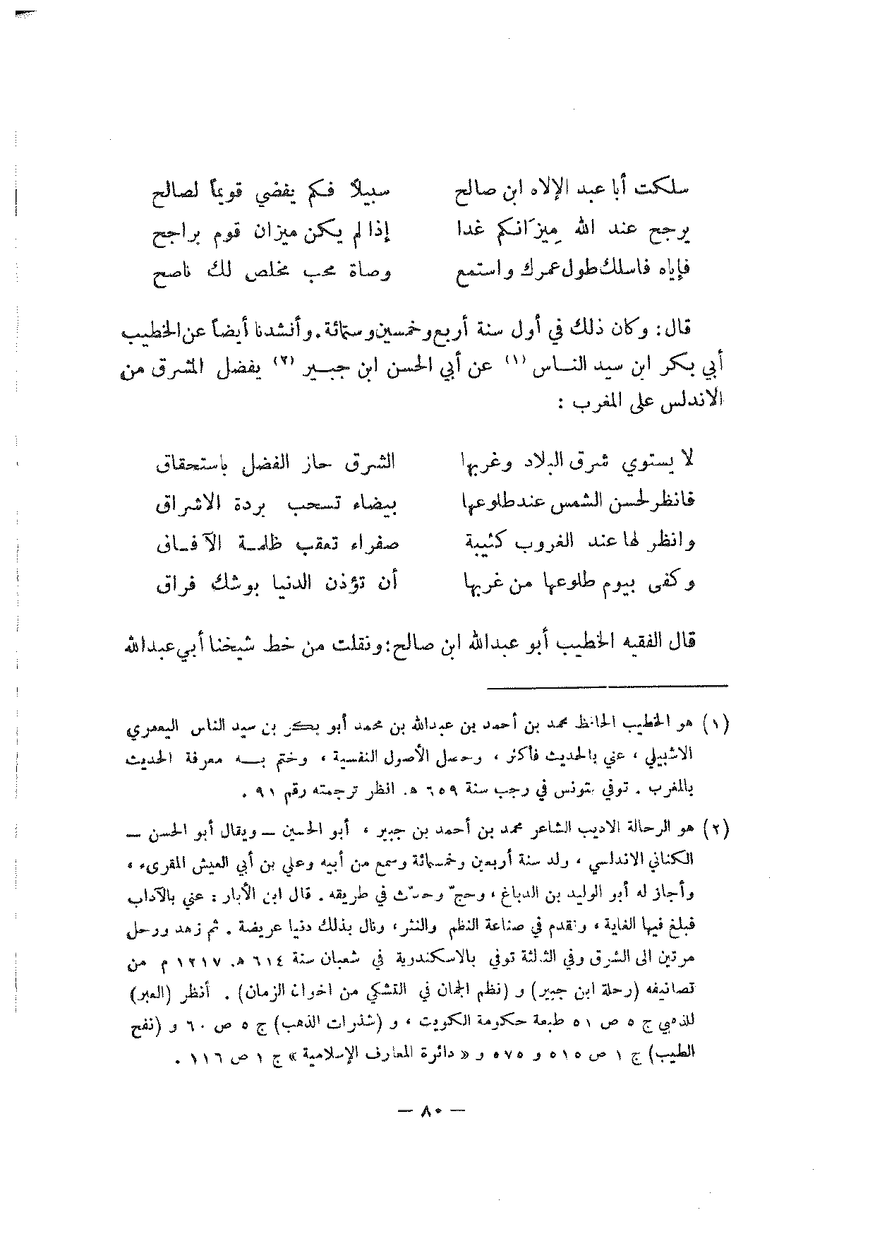 قال: وكان ذلك في أول سنة أربع وخمسين وستمائة. وأنشدنا أيضا عن الخطيب أبي بكر ابن سيد الناس عن أبي الحسن ابن جبير يفضل المشرق من الأندلس على المغرب: