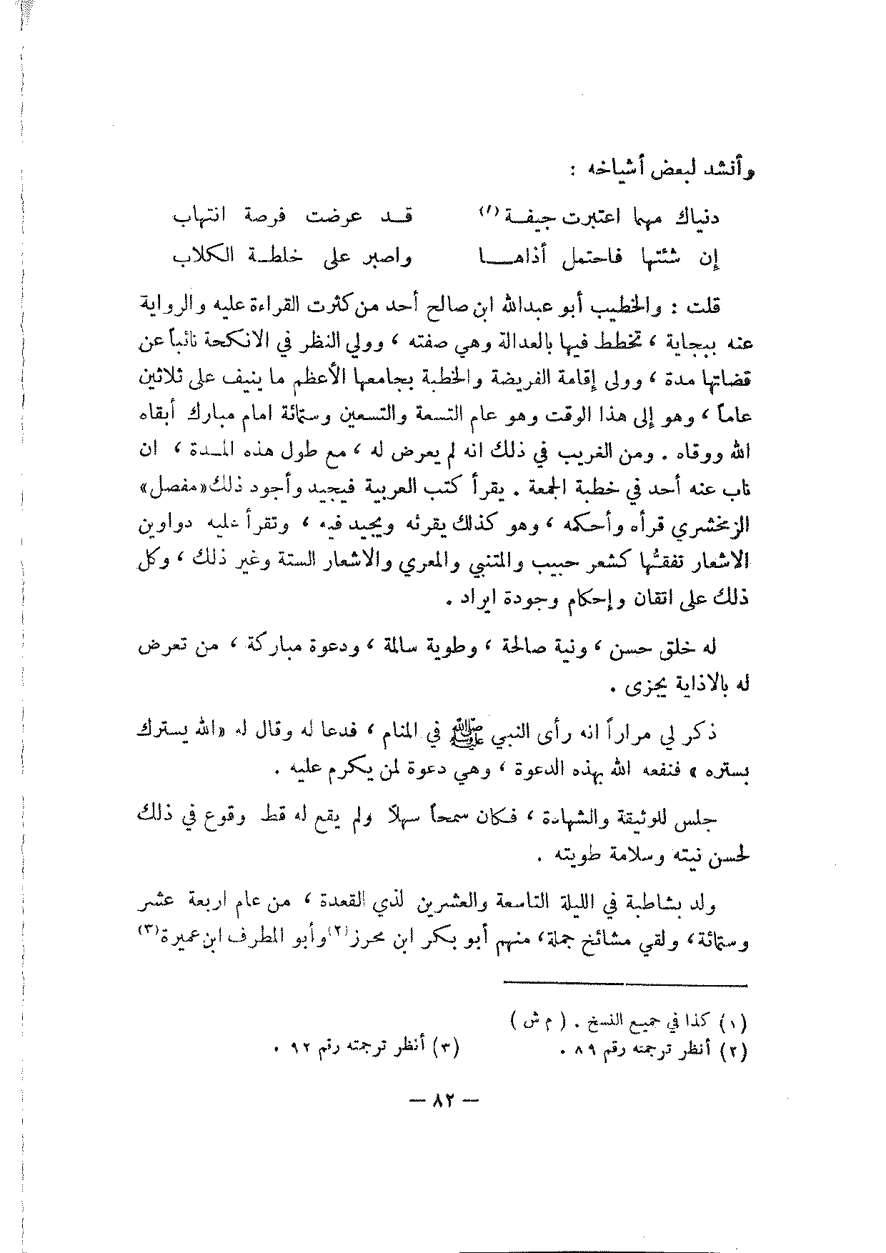 قلت: والخطيب أبو عبد الله ابن صالح أحد من كثرت القراءة عليه والرواية عنه ببجاية، تخطط فيها بالعدالة وهي صفته، وولي النظر في الانكحة نائبا عن قضاتها مدة، وولى إقامة الفريضة والخطبة بجامعها الأعظم ما ينيف على ثلاثين عاما، وهو إلى هذا الوقت وهو عام التسعة والتسعين وستمائة إمام مبارك أبقاه الله ووقاه. ومن الغريب في ذلك إنه لم يعرض له، مع طول هذه المدة، أن ناب عنه أحد في خطبة الجمعة. يقرأ كتب العربية فيجيد وأجود ذلك "مفصل" الزمخشري قرأه وأحكمه، وهو كذلك يقرئه ويجيد فيه، وتقرأ عليه دواوين الأشعار تفقها كشعر حبيب والمتنبي والمعري والأشعار الستة وغير ذلك، وكل ذلك على إتقان وإحكام وجودة إيراد.
