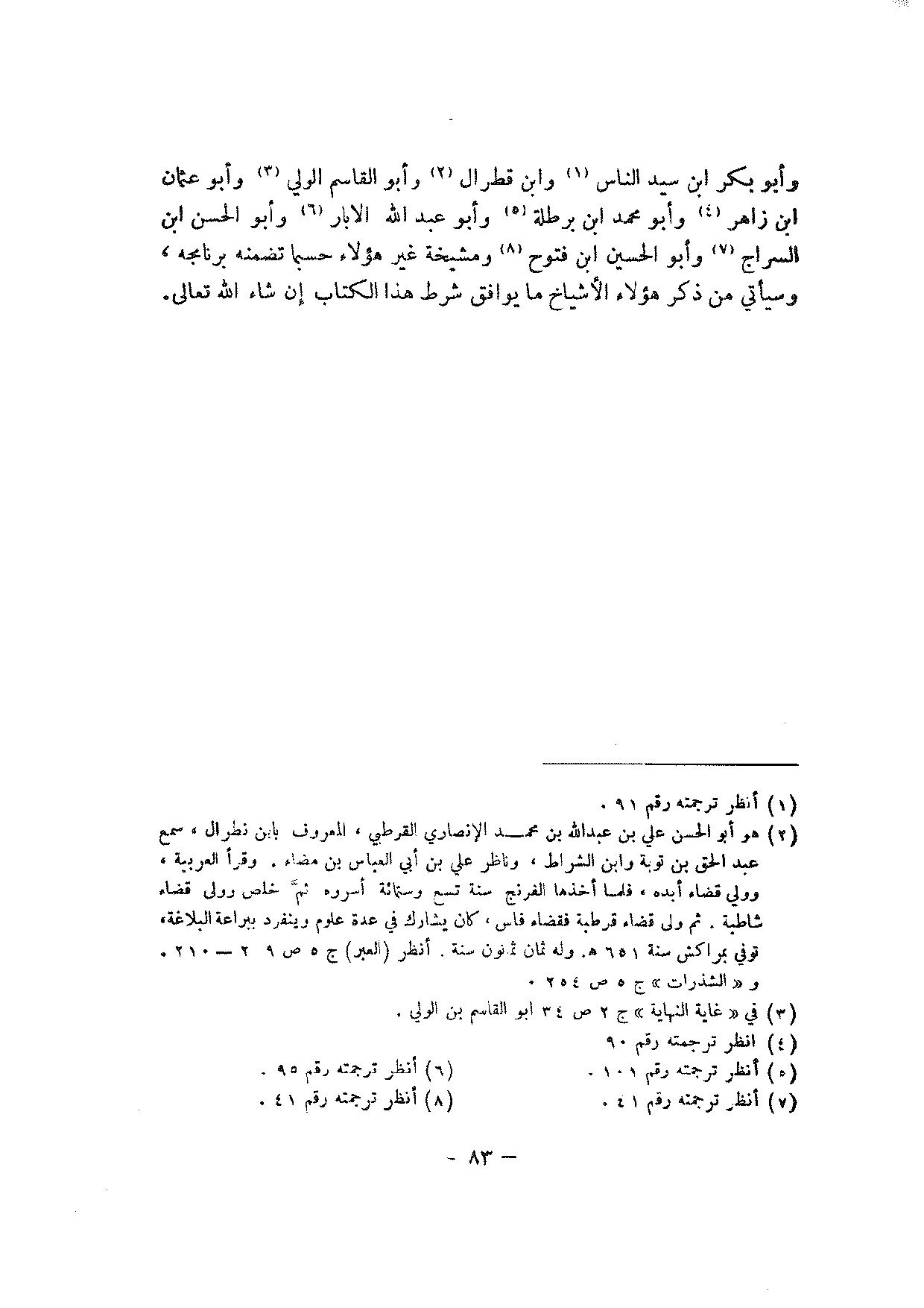وأبو بكر ابن سيد الناس وابن قطرال وأبو القاسم الولي وأبو عثمان ابن زاهر وأبو محمد ابن برطلة وأبو عبد الله الابار وأبو الحسن ابن السراج وأبو الحسين ابن فتوح ومشيخة غير هؤلاء حسبما تضمنه برنامجه، وسيأتي من ذكر هؤلاء الأشياخ ما يوافق شرط هذا الكتاب أن شاء الله تعالى.