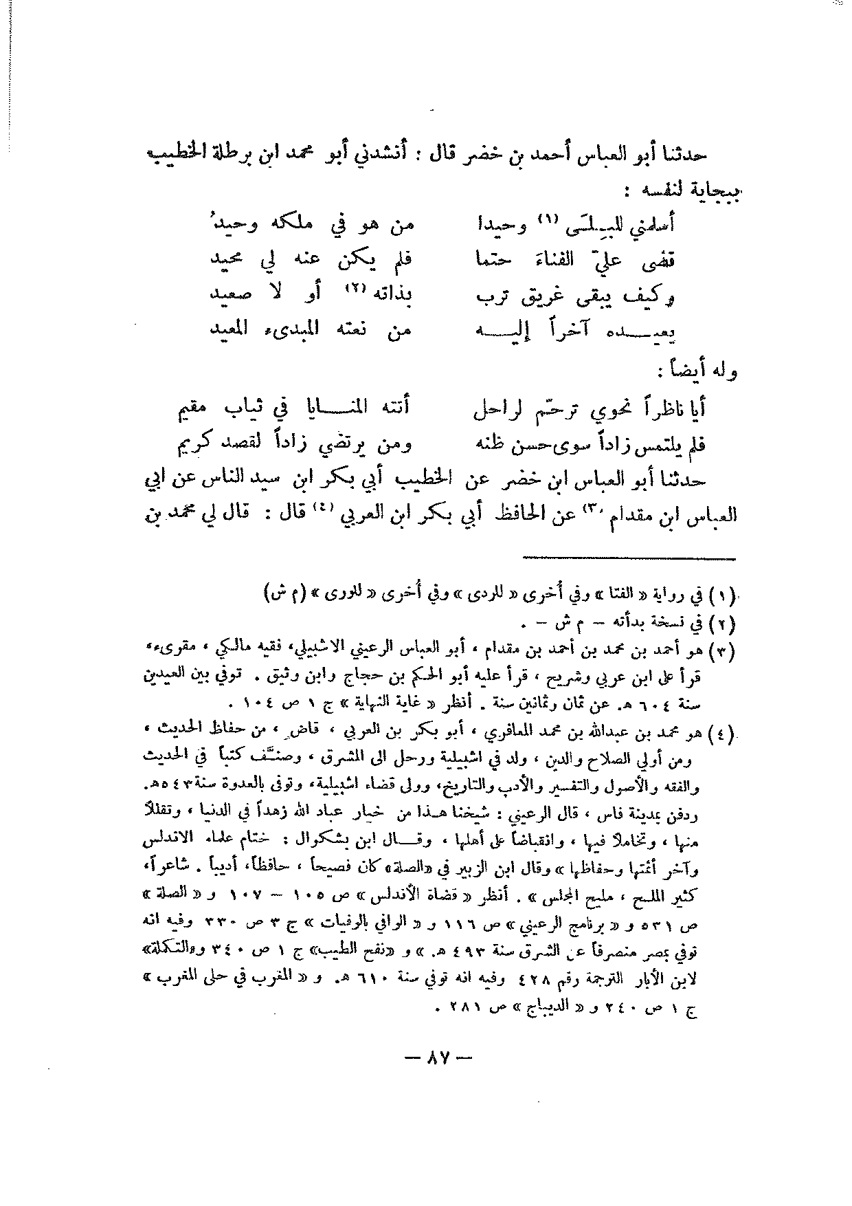 حدثنا أبو العباس ابن خضر عن الخطيب أبي بكر ابن سيد الناس عن أبي العباس ابن مقدام عن الحافظ أبي بكر ابن العربي قال: قال لي محمد بن