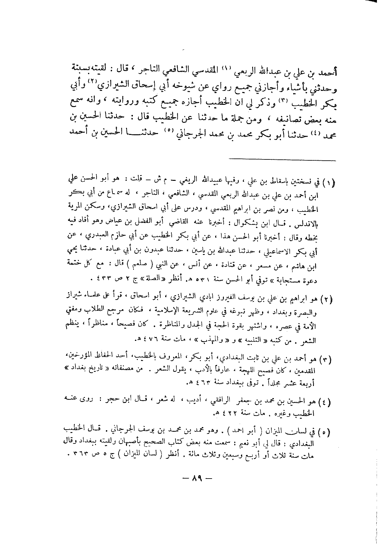 أحمد بن علي بن عبد الله الربعي المقدسي الشافعي التاجر، قال: لقيته بسبتة وحدثني بأشياء وأجازني جميع رواي عن شيوخه أبي إسحاق الشيرازي وأبي بكر الخطيب وذكر لي أن الخطيب أجازه جميع كتبه وروايته، وإنه سمع منه بعض تصانيفه، ومن جملة ما حدثنا عن الخطيب قال: حدثنا الحسين بن محمد حدثنا أبو بكر محمد بن محمد الجرجاني حدثنا الحسين بن أحمد