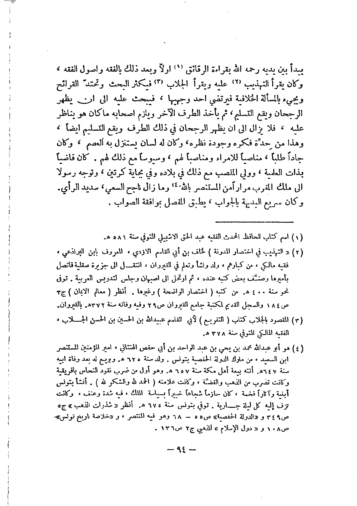 يبدأ بين يديه رحمه الله بقراءة الرقائق أولا وبعد ذلك بالفقه وأصول الفقه، وكان يقرأ التهذيب عليه ويقرأ الجلاب فيكثر البحث وتحتد القرائح ويجيء بالمسألة الخلافية فيرتضي أحد وجهيها، فيبحث عليه إلى أن يظهر الرجحان ويقع التسليم، ثم يأخذ الطرف الآخر ويلزم أصحابه ما كان هو يناظر عليه، فلا يزال إلى أن يظهر الرجحان في ذلك الطرف ويقع التسليم أيضا، وهذا من حدة فكره وجودة نظره، وكان له لسان يستنزل به العصم، وكان جادا طلبا، مناصبا لهم، وسيوسا مع ذلك لهم. كان قاضيا بذات العلمية، وولي المنصب مع ذلك في بلاده وفي بجاية كرتين، وتوجه رسولا إلى ملك المغرب مرارا من المستنصر بالله وما زال ناجح السعي، سديد الرأي. وكان سريع البديهة بالجواب، يطبق المفصل بموافقة الصواب.
