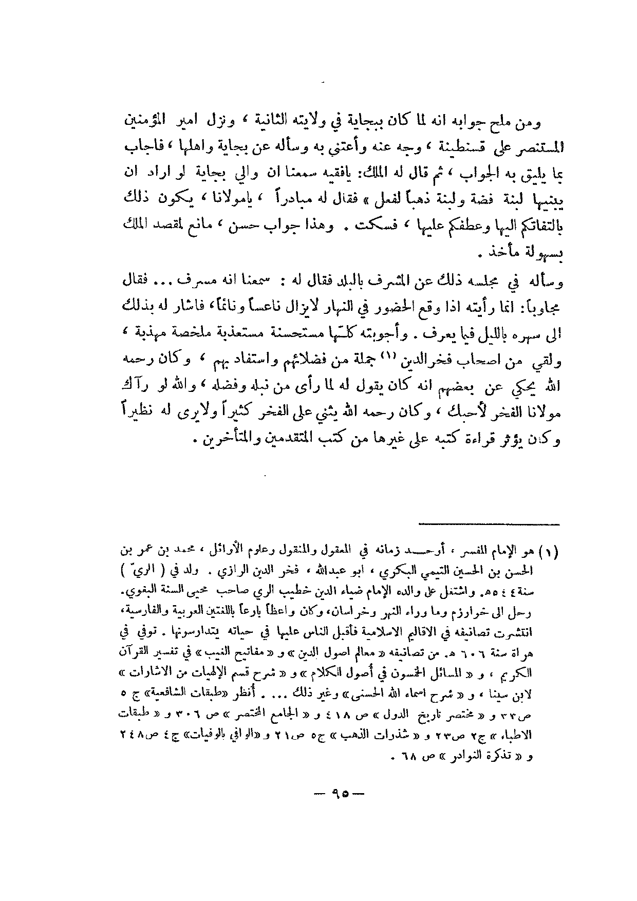 وسأله في مجلسه ذلك عن المشرف بالبلد فقال له: سمعنا إنه مسرف ... فقال مجاوبا: إنما رأيته إذا وقع الحضور في النهار لا يزال ناعسا ونائما، فأشار له بذلك إلى سهره بالليل فيما يعرف. وأجوبته كلها مستحسنة مستعذبة ملخصة مهذبة، ولقي من أصحاب فخر الدين جملة من فضلائهم واستفاد بهم، وكان رحمه الله يحكي عن بعضهم إنه كان يقول له لما رأى من نبله وفضله، والله لو رآك مولانا الفخر لأحبك، وكان رحمه الله يثني على الفخر كثيرا ولا يرى له نظيرا وكان يؤثر قراءة كتبه على غيرها من كتب المتقدمين والمتأخرين.