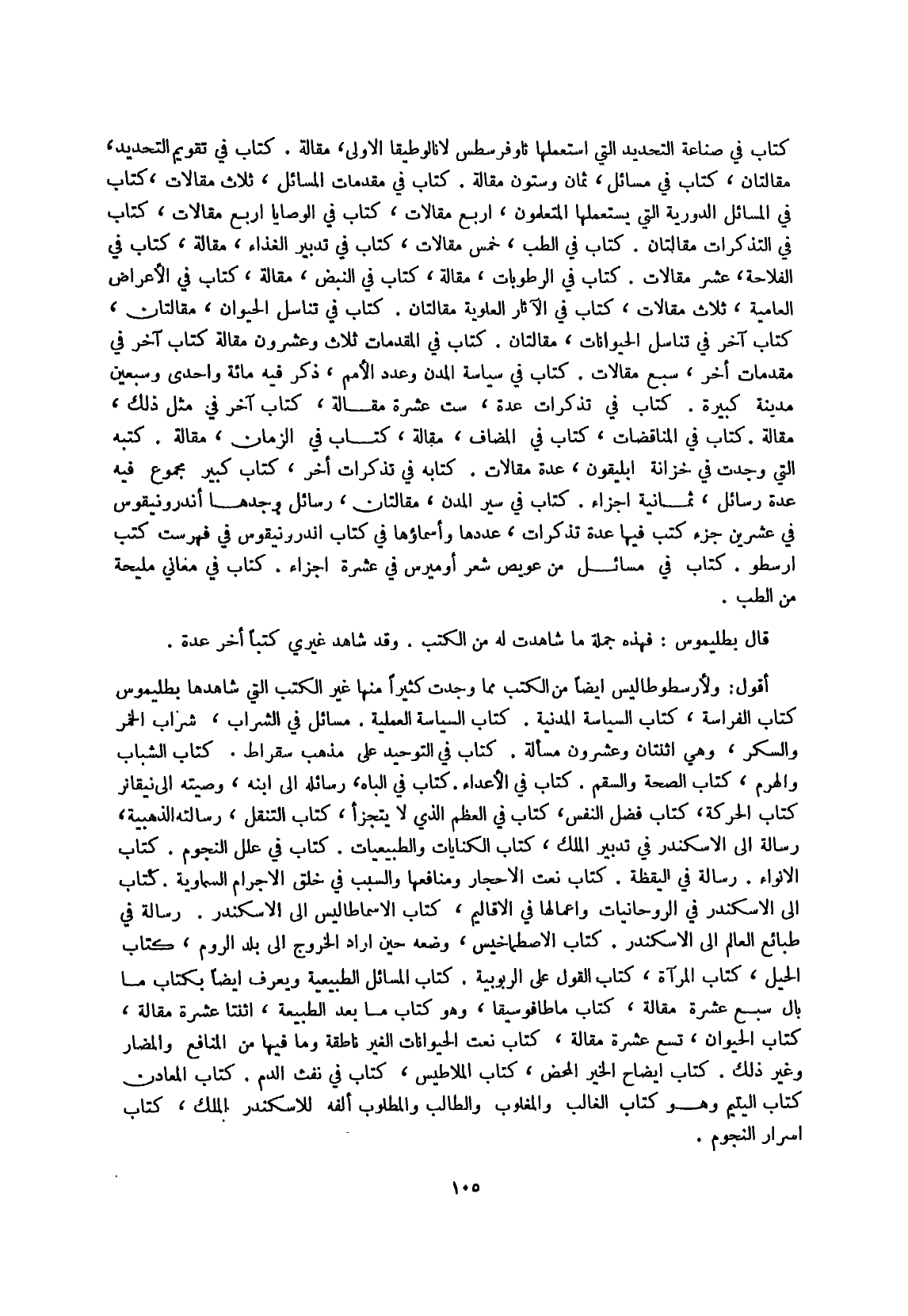 أَقُول ولأرسطوطاليس أَيْضا من الْكتب مِمَّا وجدت كثيرا مِنْهَا غير الْكتب الَّتِي شَاهدهَا بطليموس كتاب الفراسة كتاب السياسة المدنية